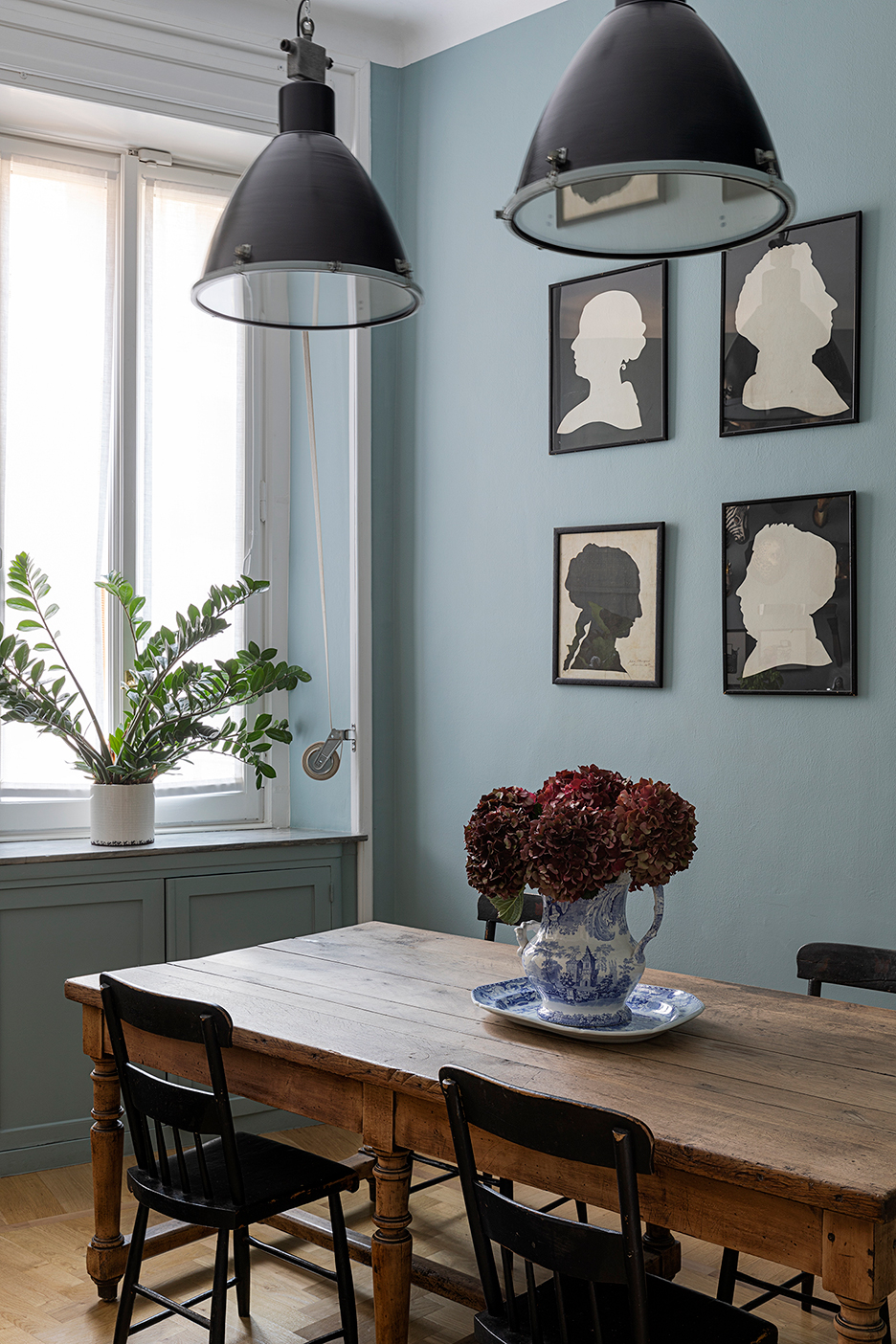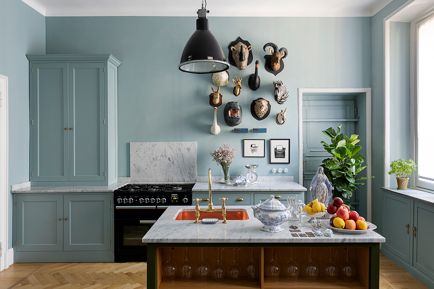 “I just had to find the right color combination for the walls, and all the rest followed,” she says. In the living room, Rhubarb by Paint and Paper Library mingles with a lighter version of the shade she created by adding a dash of white. In the kitchen, Sea Nor Sky licks the entire space.