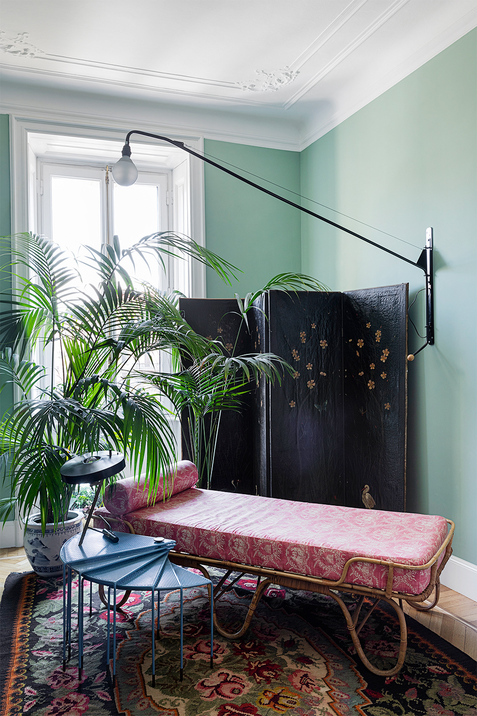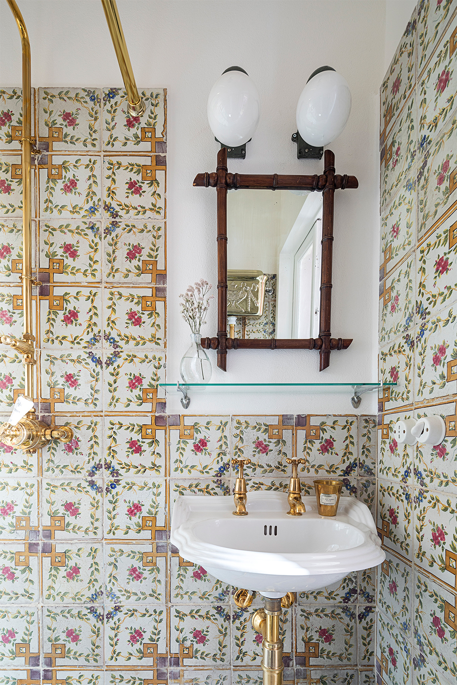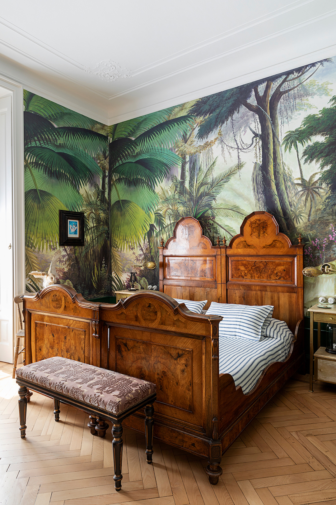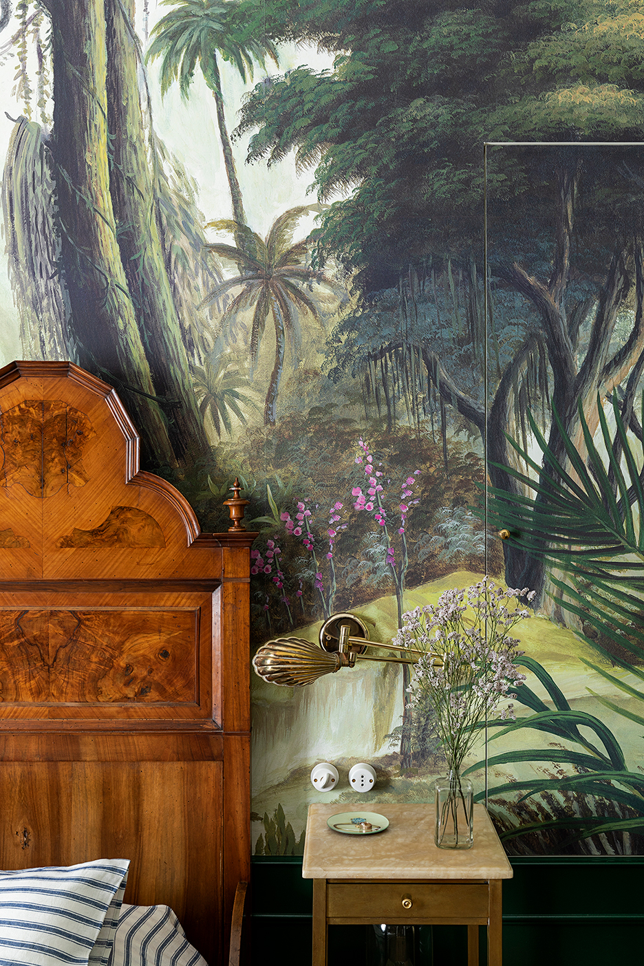 But in the main bedroom and bathroom, she swapped paint for two different, but equally prismatic mediums: wallpaper and tile. A junglescape from Ananbô surrounds the room where she sleeps, and in a powder room, La Riggiola vintage tile creates a secret garden feel.