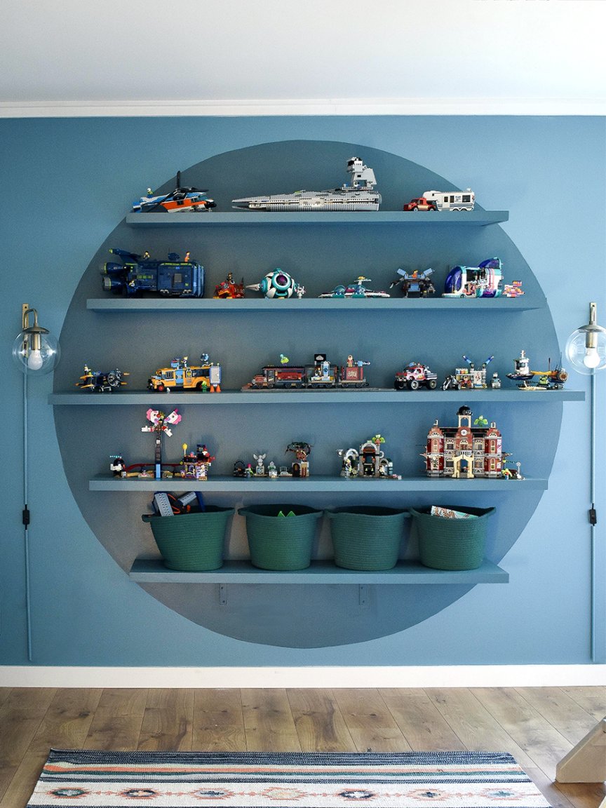 Not too long ago, in a galaxy not so far, far away, DIYer Lindsey Joy set out on revamping her sons’ shared bedroom. The driving factor? Legos—lots of them. She didn’t want to hide their prized creations, but she also didn’t want to step on them. So Joy came up with an open shelving display that would serve as both storage and statement piece. “They love Star Wars, and a circle felt lunar to me,” she says.