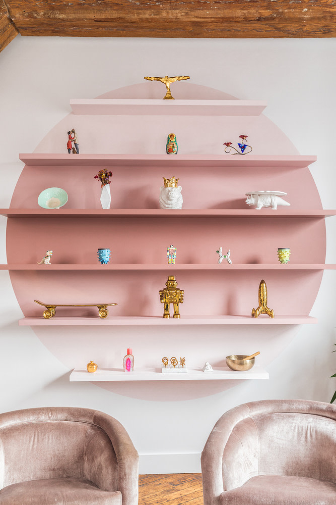 Kids at heart can get behind this playful storage solution, too. Laura Lane and Nic Rad had a round shelf unit custom-built (that’s right, the circle and the shelves are one) for their Brooklyn living room and painted it an ombré pink scheme. The planks are dotted with artful knickknacks. This way they can have all their various objects on display without the house feeling cluttered.
