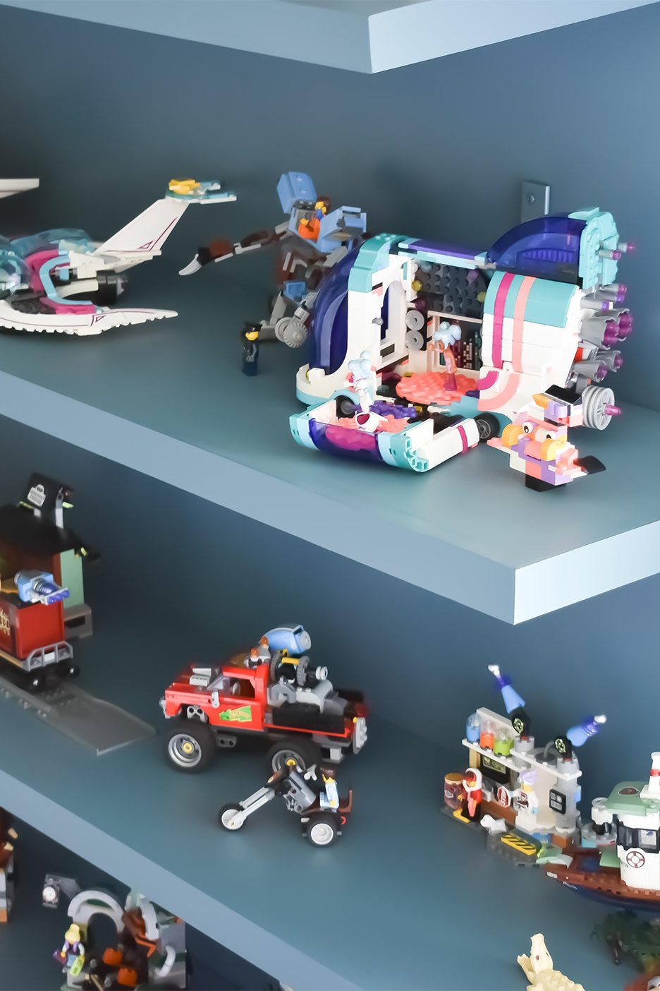 The boys’ most elaborate Lego structures live higher up, where they’re still in view but not in danger of toppling over. “The lighthouse was the most fun to make because I like building all the different moving parts,” says Blake. Another elaborate complex: the Fist Spaceship (Grayson’s pride and joy). “I liked filling the inside with tiny dinosaurs,” he says.