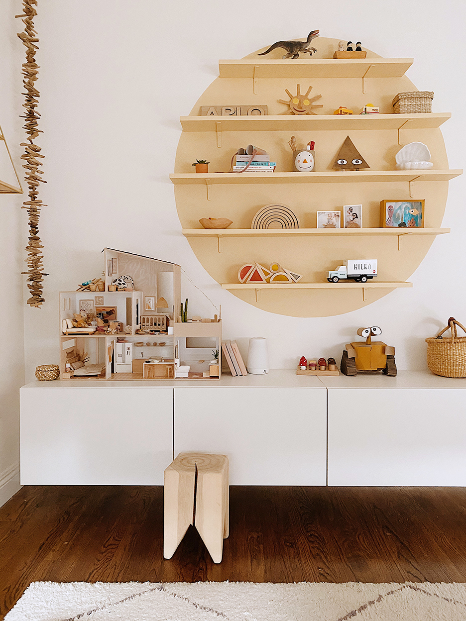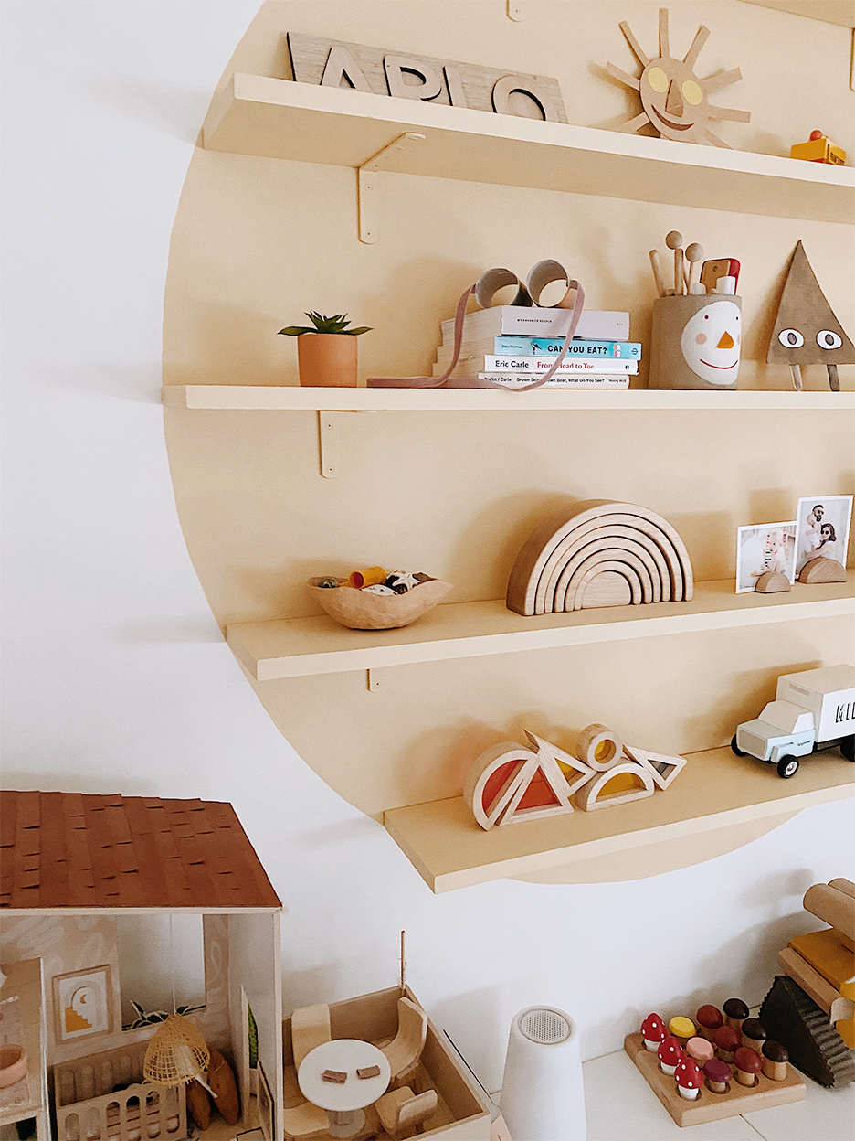 Depending on the shelves you buy, you’ll likely need reinforcement. Joy installed 6-inch-long metal brackets underneath her shelves to hold them in place (just in case Grayson decides to use them as a ladder again). After repainting her mustard-tone circle mural (pictured above), fellow DIYer Molly Madfis learned it’s best to paint the metal pieces the same color as the wall so they’re virtually unnoticeable.