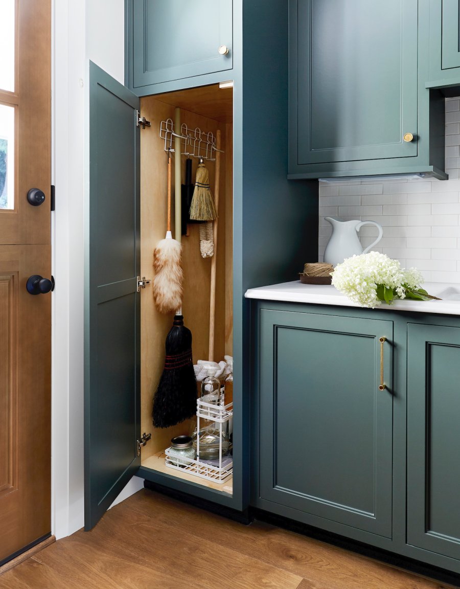 In such a big space, it’s important to prioritize one section. When it comes to the floors, give them a good sweep and go over them with a damp mop. Then the important part: Wipe down the baseboards. Crumbs like to hide out along the perimeter of the room.