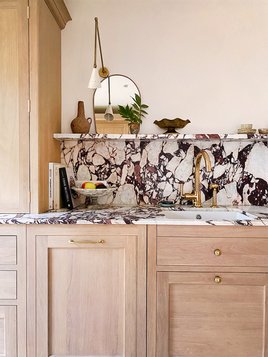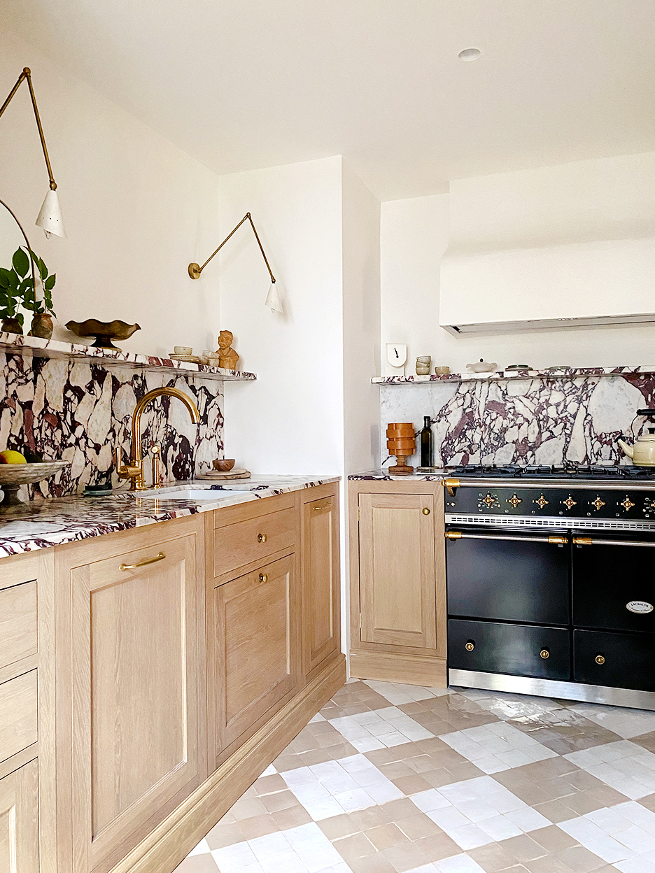 Becca stood her ground when the designer kept adding upper cabinets to the sketch—she had other plans for the blank wall. Specifically, a Calacatta Viola marble countertop and backsplash with a matching shelf. “I had seen a picture of a kitchen with that stone on the baseboards and the door frame,” she remembers “I fell in love. It was the most beautiful thing I had ever seen. The cabinet company tried to talk me out of the ledge, saying it wasn’t really practical. And I was like, well, that’s not really the point. I don’t plan to store things on it; I just want it to be beautiful.” It was her biggest splurge. To balance out the expense, Becca covered the rest of the walls in a warm gray-white limewash, which she applied herself.