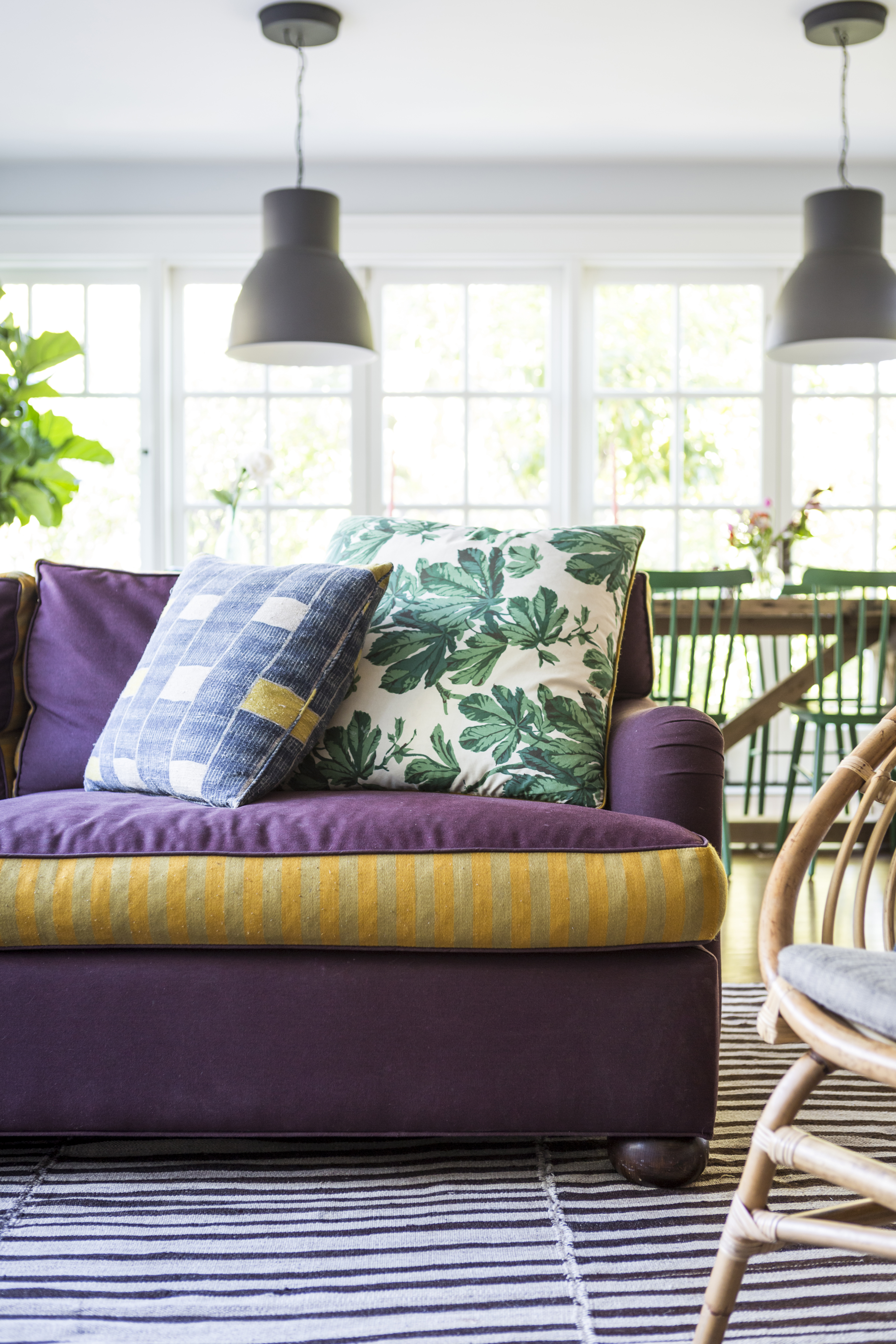 To counter some of the house’s darker corners, Merrill opened up its low-lying and slanted ceilings by using a glowing palette of rich pigments—a violet-toned entryway, a peachy pink powder room, and a sea glass blue living room—to lighten and brighten the dimmer places. Now with the exception of the light-flooded sunroom and kitchen, every room in the house has its own illuminating shade. “It was both freeing and terrifying to push the limits of color,” Merrill says. “So whatever the house lacked in natural light, we made up for in spirit.”