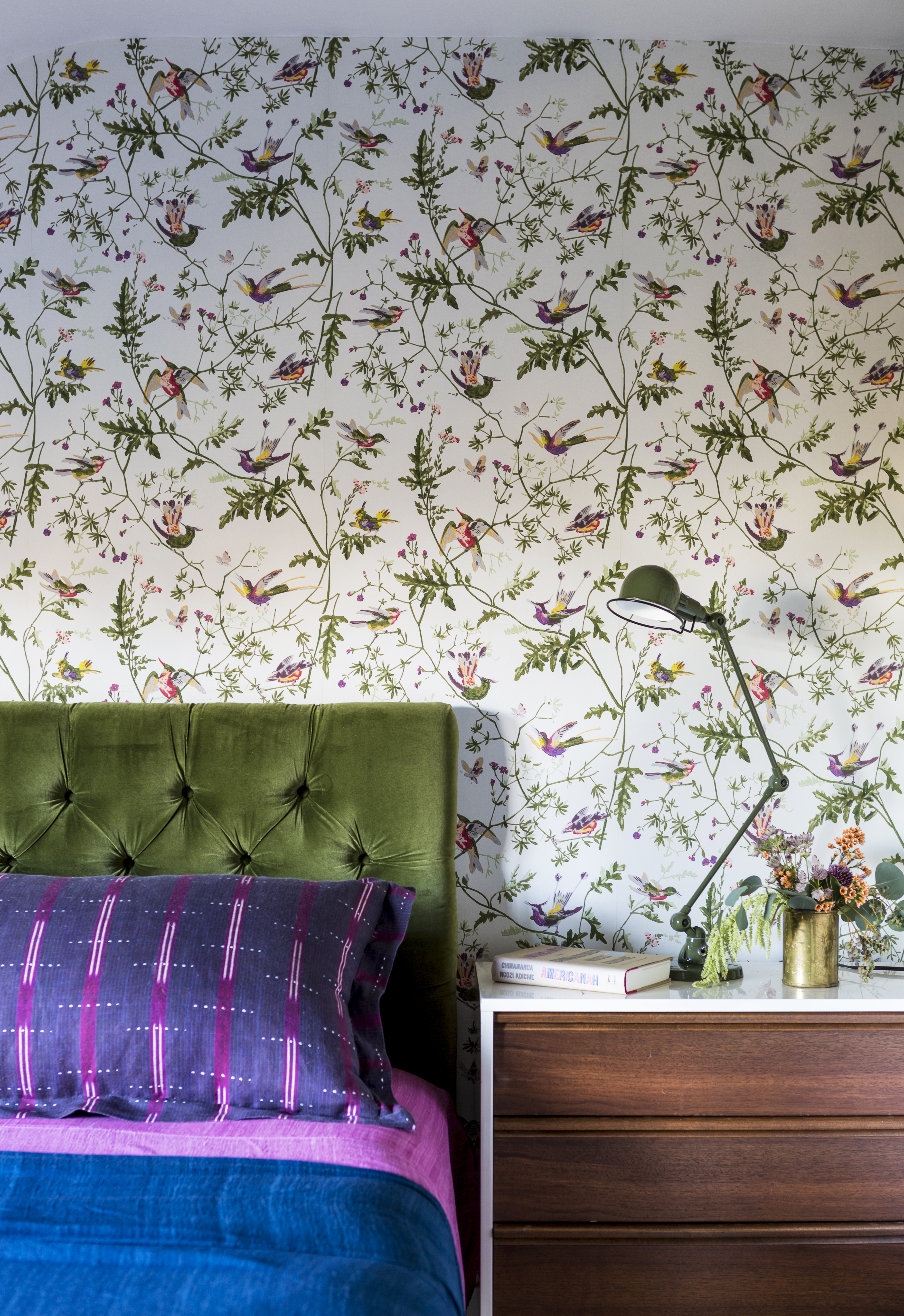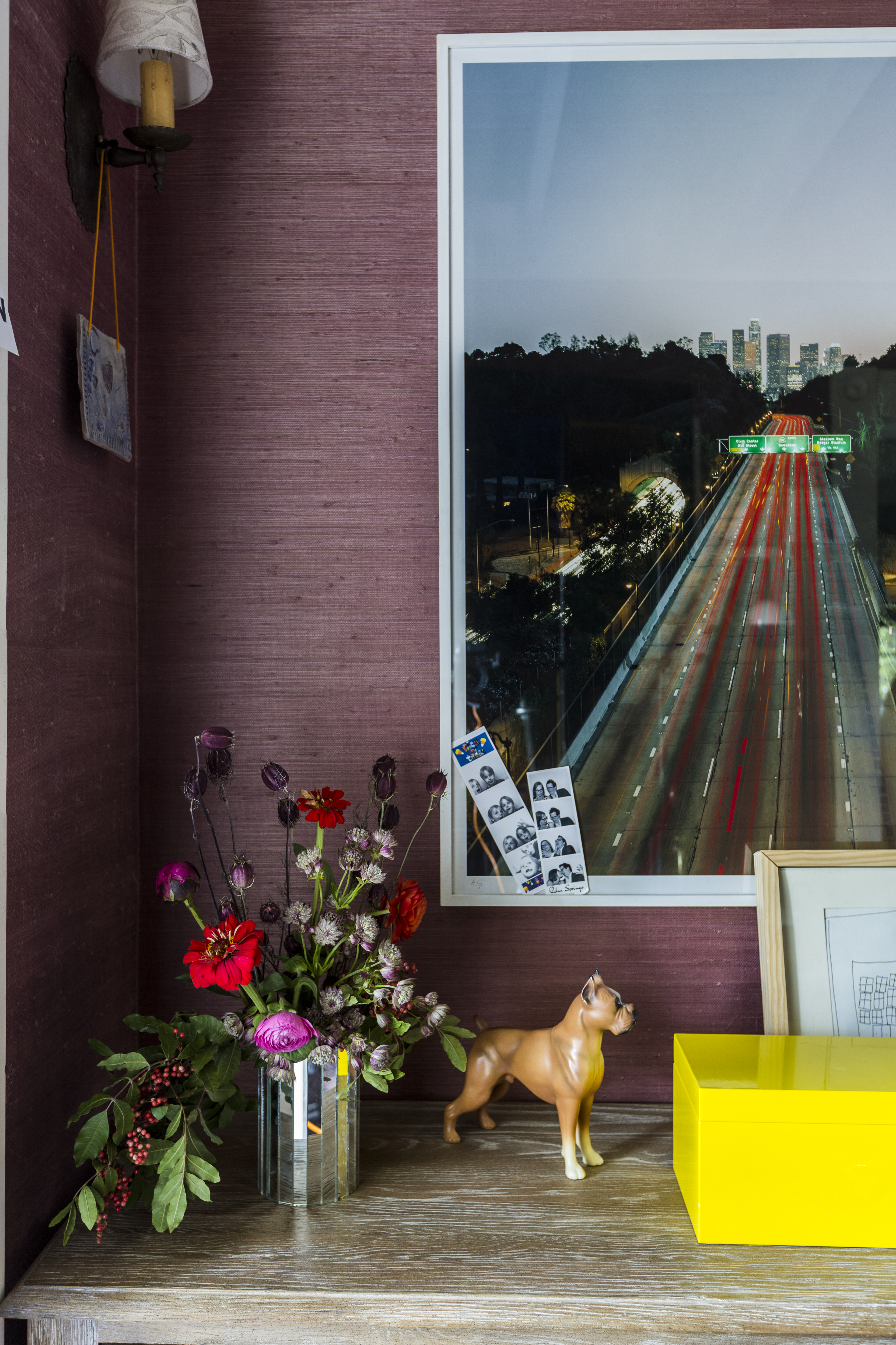 One of the most striking elements of Merrill’s design is her daring use of distinct patterns—specifically, her keen eye for pairing unexpected textiles. Along with the Fornasetti floral wallpaper she used in the playroom, Merrill covered the master bedroom in a fresh flora-and-fauna print. Perhaps most impressive is her ability to layer even bolder pieces of art and textiles—including faux bois upholstery, motion photography, and lots and lots of deep-hued fabrics—without ever seeming to overwhelm a room. “When it come to patterns, you have to strike a balance,” Merrill explains. “Take a little floral, mix in something graphic, add an unexpected texture, and always have a stripe thrown in. Plus it always looks better once the dogs and kids have been lying on it for a few months anyway.”