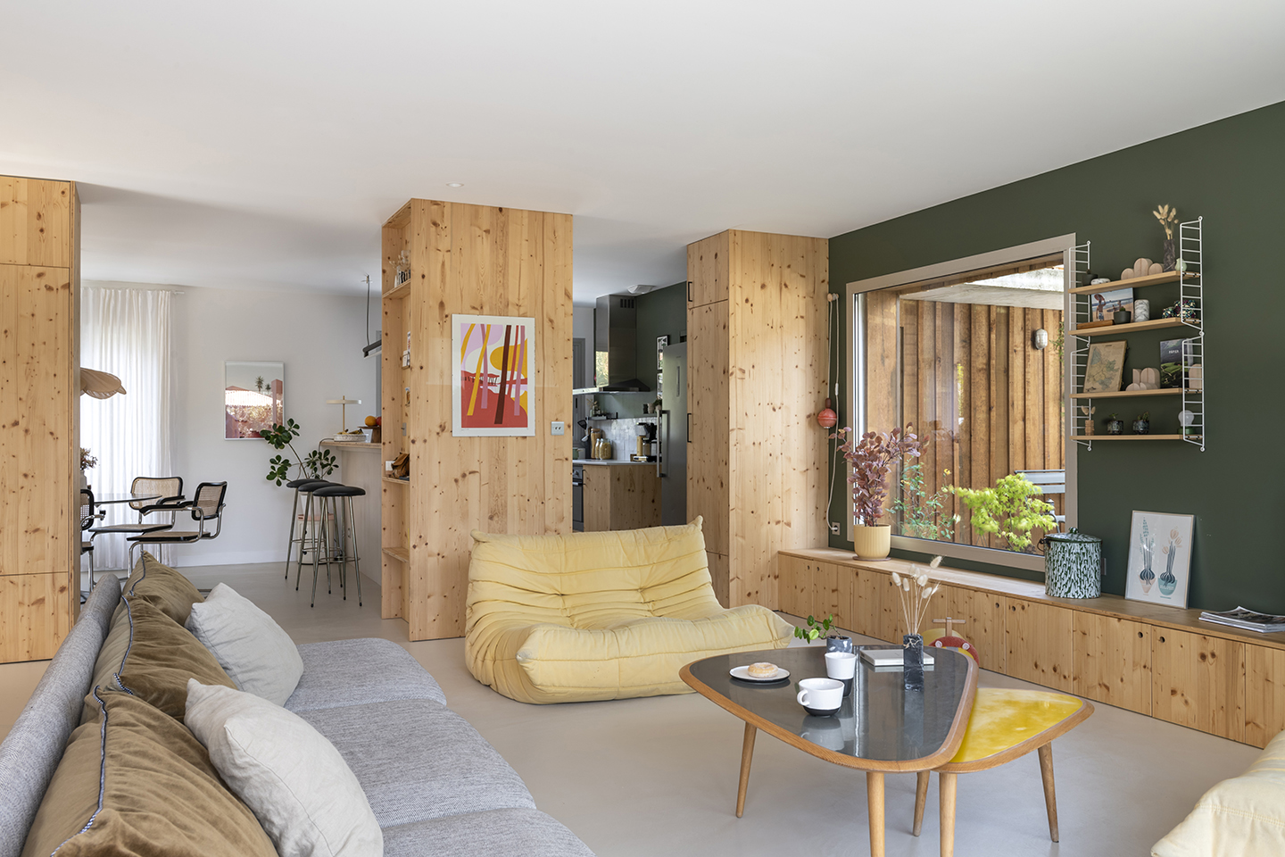 When architects Morgane Thomas and Rémi Gilliard decided to leave northern France in 2018 to live closer to the ocean, along the southwestern Landes coast in Capbreton, they set out to build a home they could live in year-round but that always made them feel like they were on vacation. “When our friends visit us, they always say that there’s something special that makes this home peaceful,” notes Thomas. That je ne sais quoi probably has something to do with the big sliding glass door leading to the pool and all the untreated wood inside. The built-in dividers in the living room and the kids’ bedroom, as well as the kitchen cabinets, are all made out of white spruce, a pale yellowish, straight-grained variety that met one of the couple’s main criteria: They wanted to make the space as bright as possible while keeping it very minimalistic. “We wanted the house to feel like a cozy ocean cabin,” says Thomas.