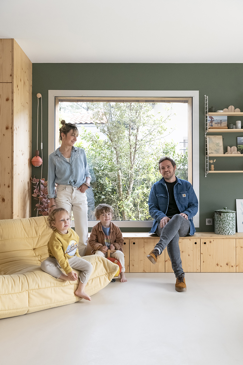 The designers took full advantage of the home’s horizontal space, too: A long, low-profile unit runs the span of the living room wall. The piece doubles as a stand for the family’s TV, as well as bonus seating for guests, but underneath, it hides 3-year-old Joseph’s and 4-year-old Léonard’s many toys—in other words clutter can be swept behind the cupboard doors in a flash.