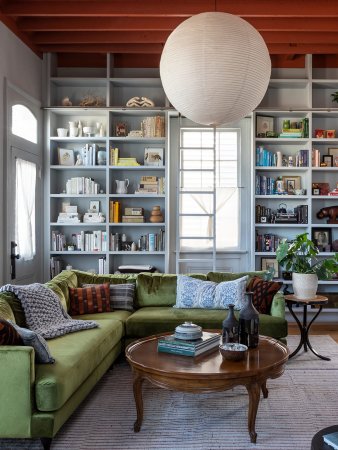 Brodie likens the home’s footprint to a nautilus shell, with the way all the rooms branch out from the curved staircase and the fact that the living room is a few steps lower than the kitchen-slash-dining zone. While there was already a half wall that marked the divide, the partition was slim and the bookcases stopped about three-quarters of the way up, leaving a lot of blank wall space. Brodie reimagined the structure by adding two large arches with deep cabinets and floating shelves for extra storage. “It feels more proportional now,” she notes.