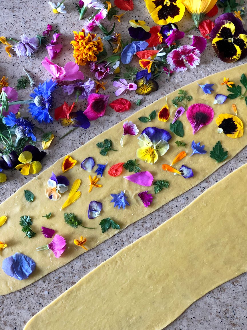 It’s a bit more laborious than your average meal, sure, but that’s the point. Carve out an afternoon and take time to roll out the dough, individually sprinkling on the multicolored petals. There’s something luxurious about a slow recipe like this; the only thing you’ll have to worry about is what to serve it with. For the record, Stern loves a brown butter sauce with slivered garlic and some lemon zest.