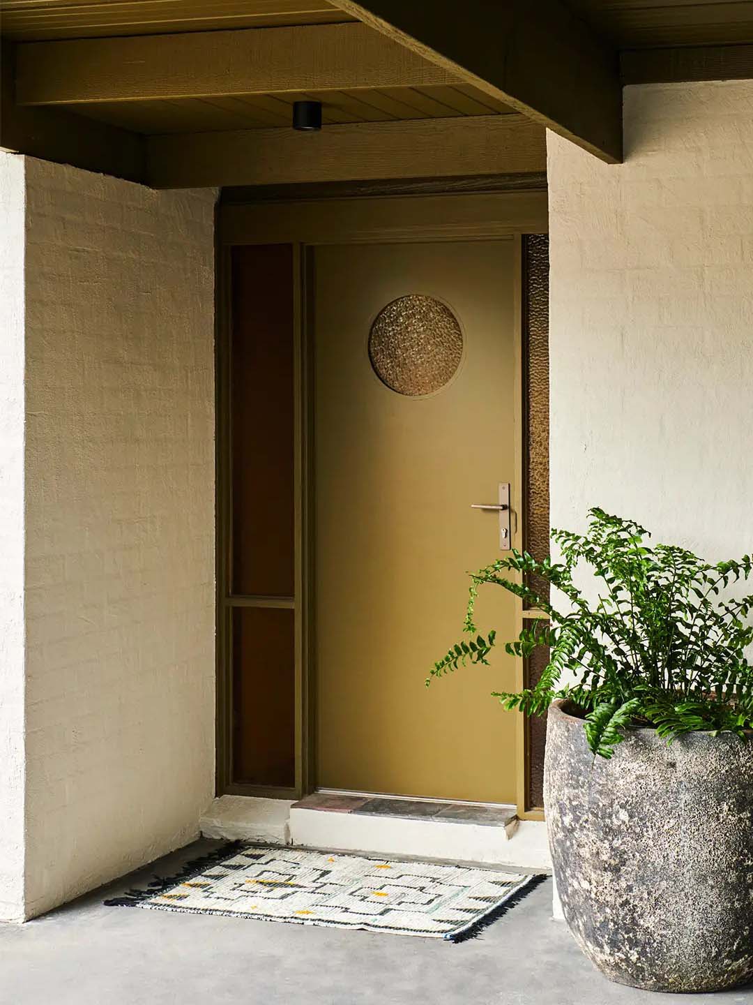 An extra-wide door deserves an extra-vibrant finish. Up close, Michelle Nadar’s canary yellow entrance evokes major jungle vibes thanks to the potted tree.