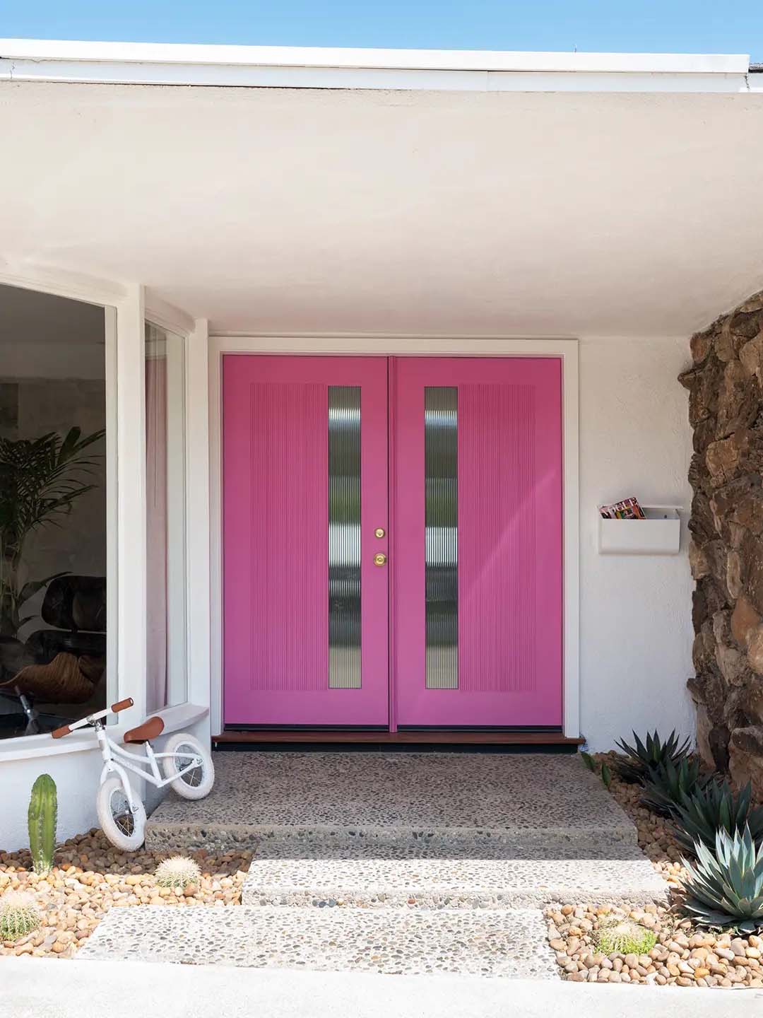 This L.A. home essentially only uses two colors inside: pink and green. So to prepare guests for the journey they’re about to embark on, designer Lizzie Green offered a clue with a fuchsia front door. Between the perky hue and the scale of the double door, you’d think you were stepping inside a mod Palm Springs house.