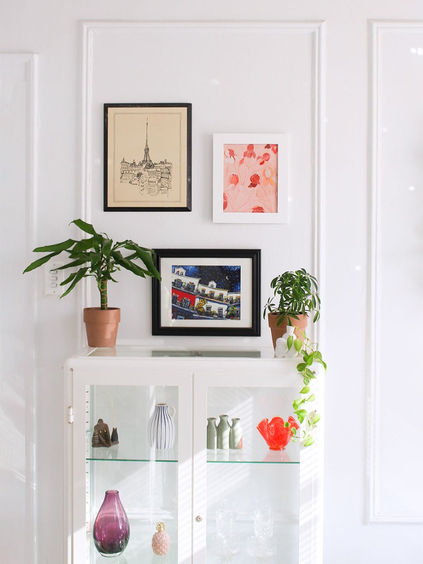 Akinbiyi snags most of her frames at the thrift store and spray-paints them to better suit her style, and hangs most with nails (with the permission of her landlord). For heavier pieces, she uses Command strips designed specifically for hanging frames.