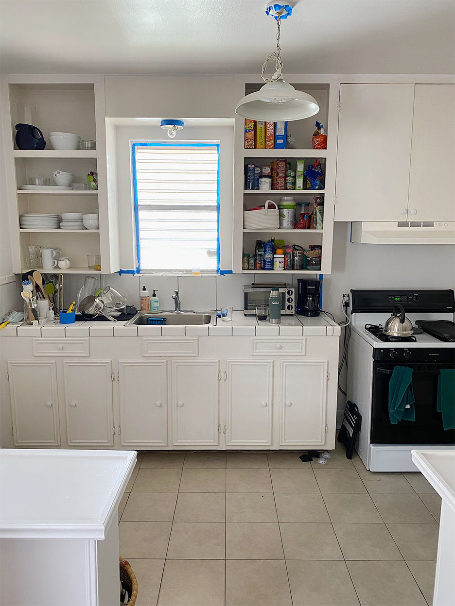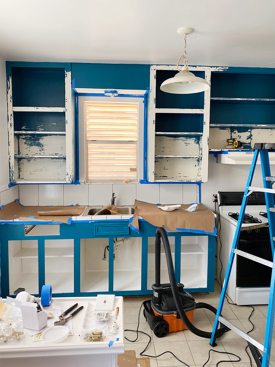 Daniel: We peeled off as much of it as we could before eventually turning to our trusty sander to handle the rest. We took the cabinets off their hinges, sanded them down, and then added a layer of well-mixed primer. Because we live in such a humid environment, we decided to add a top layer of sealer after we repainted, which we highly recommend for any kitchen cabinet project. It has made for fewer nicks and scratches.