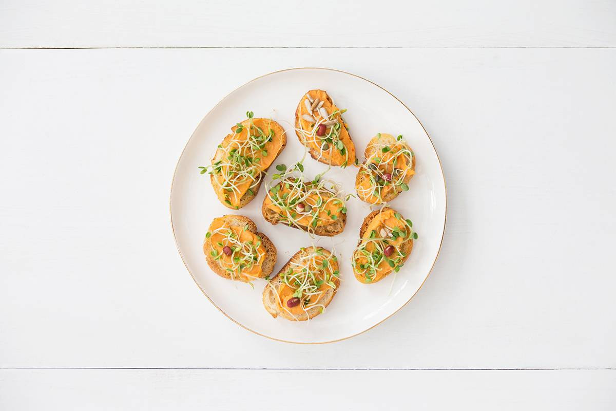 DIRECTIONS Layer a teaspoon of the hummus onto the baguette slices and top with the bean sprouts. Drizzle with a dash of olive oil, season with salt and pepper, and serve.