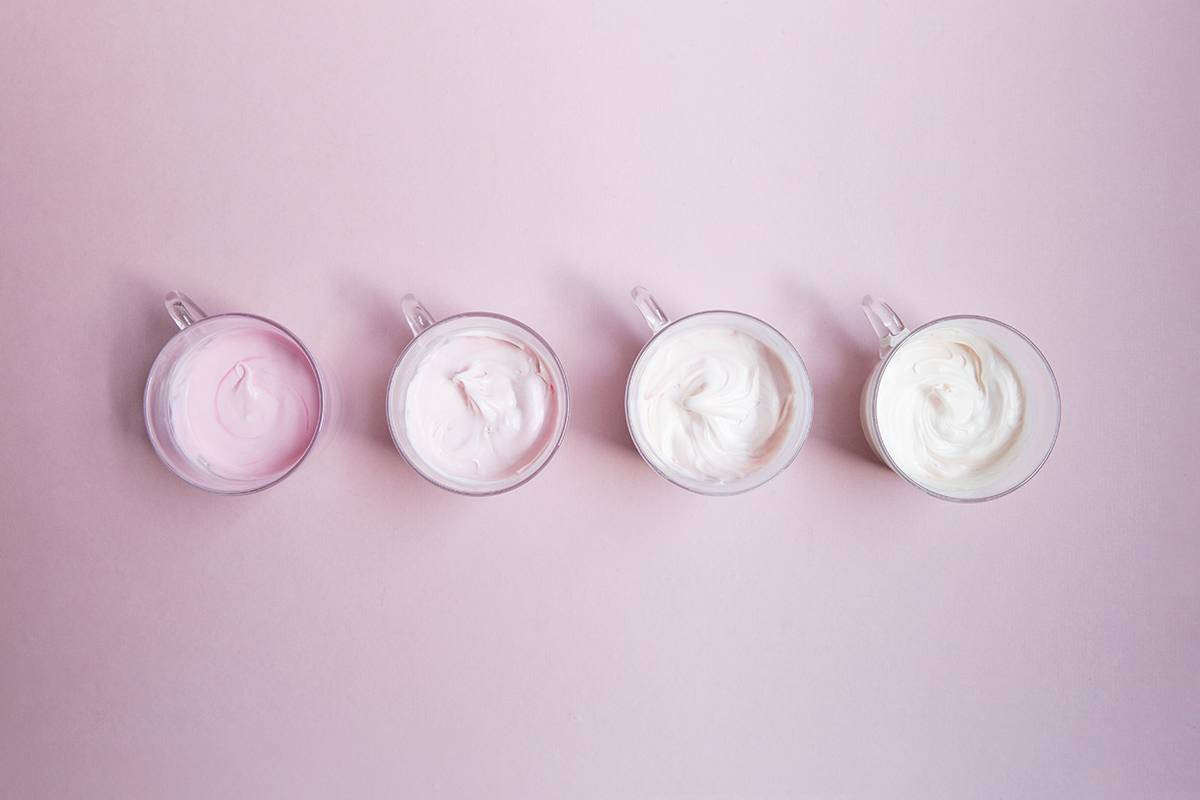 - Distribute the food coloring throughout the four cups, to create the ombre frosting. We used two drops of red food coloring in one, one drops in the second cup, half a drop in the third cup, and none for the fourth cup. Set aside.
