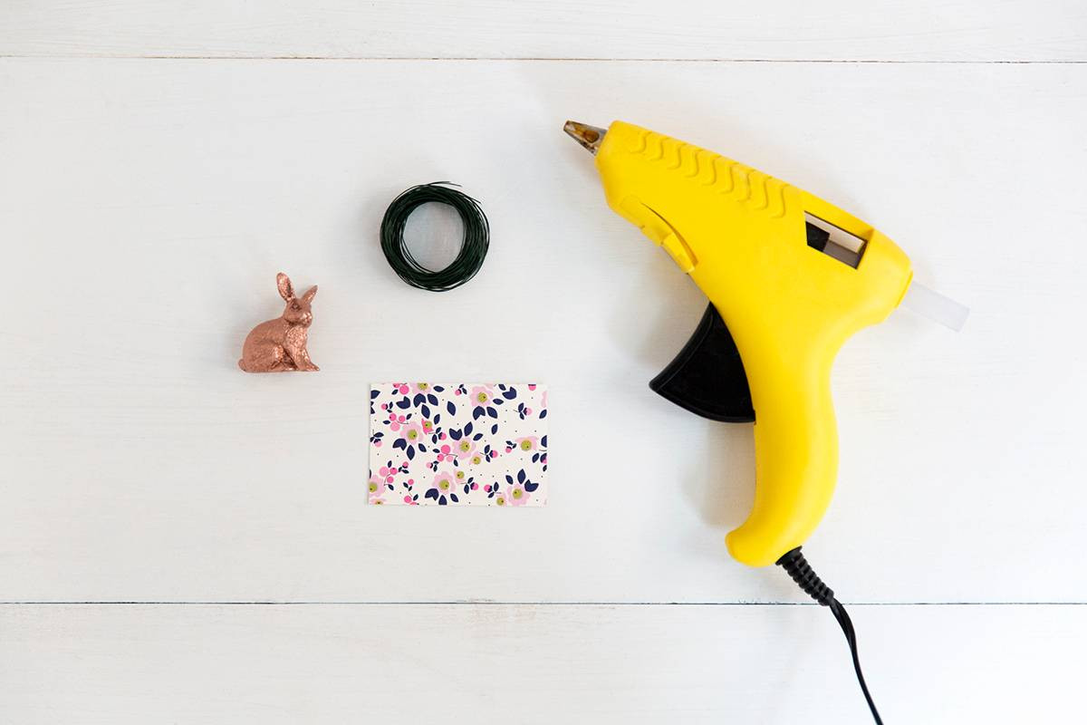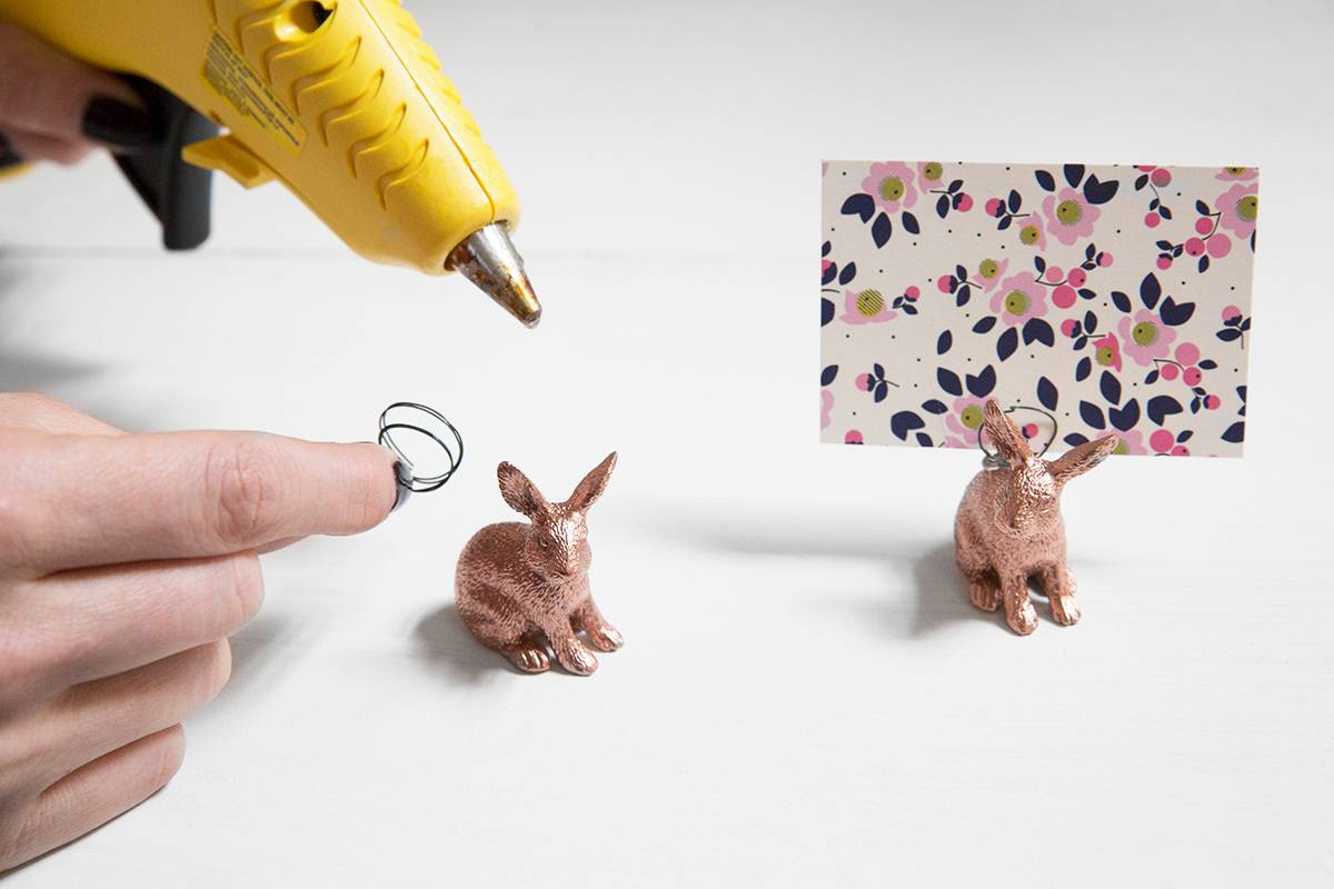 DIRECTIONS In a well-ventilated area, spray paint the rabbit figurines and allow to dry. Using the hot glue gun, affix the coiled wire onto the back of the figurine.