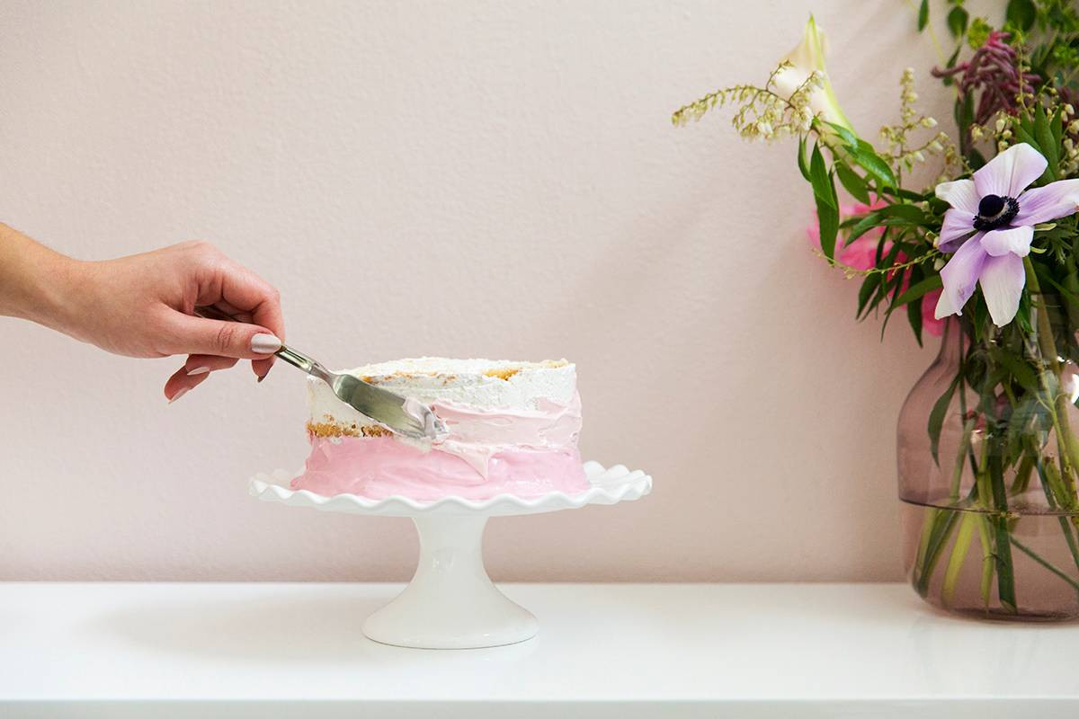 - Apply a layer of the most saturated frosting at the base of the cake, about 1 inch thick. Repeat with the remaining shades, leaving the unadulterated frosting for the top of the cake.