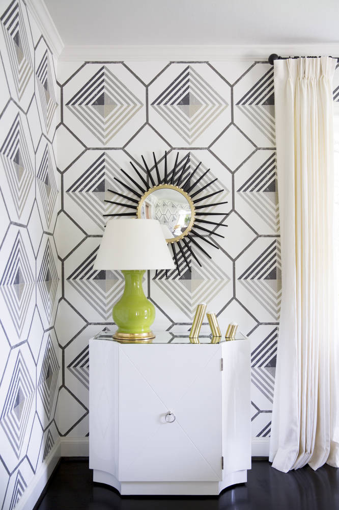 A simple, unfinished farm table counterbalances the dining room’s bold geometric wallpaper.