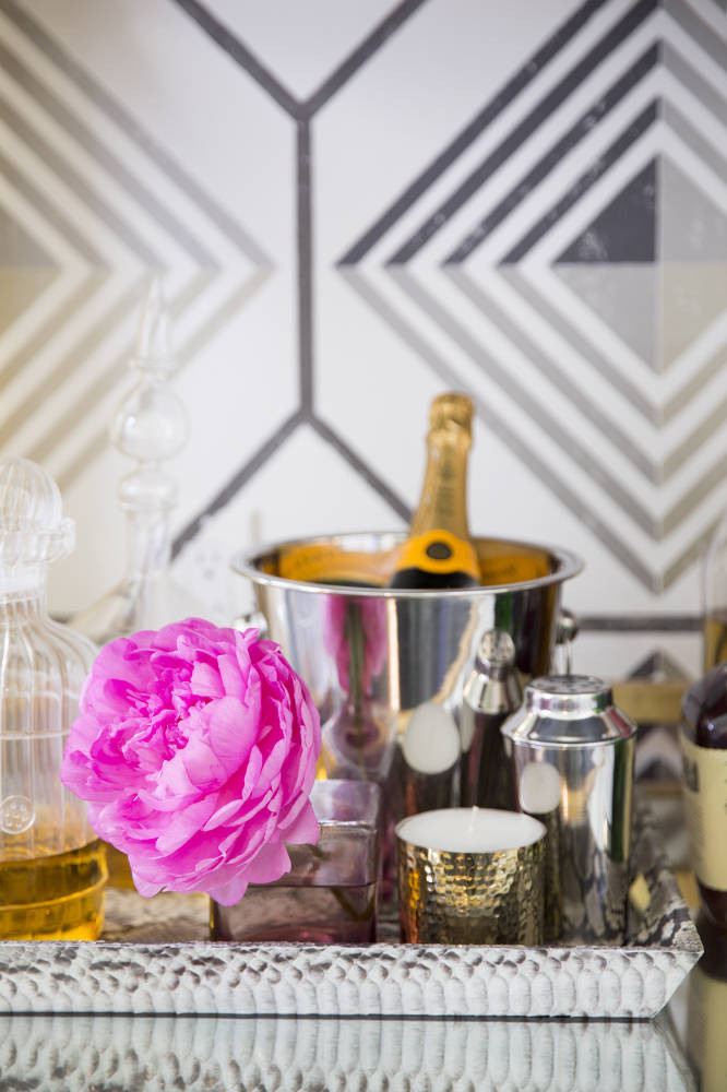 A Dorothy Draper chest lends vintage appeal to modern accessories.