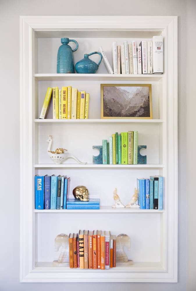 When painted white, a built-in bookshelf becomes a natural backdrop for one of Wheat’s vignettes.