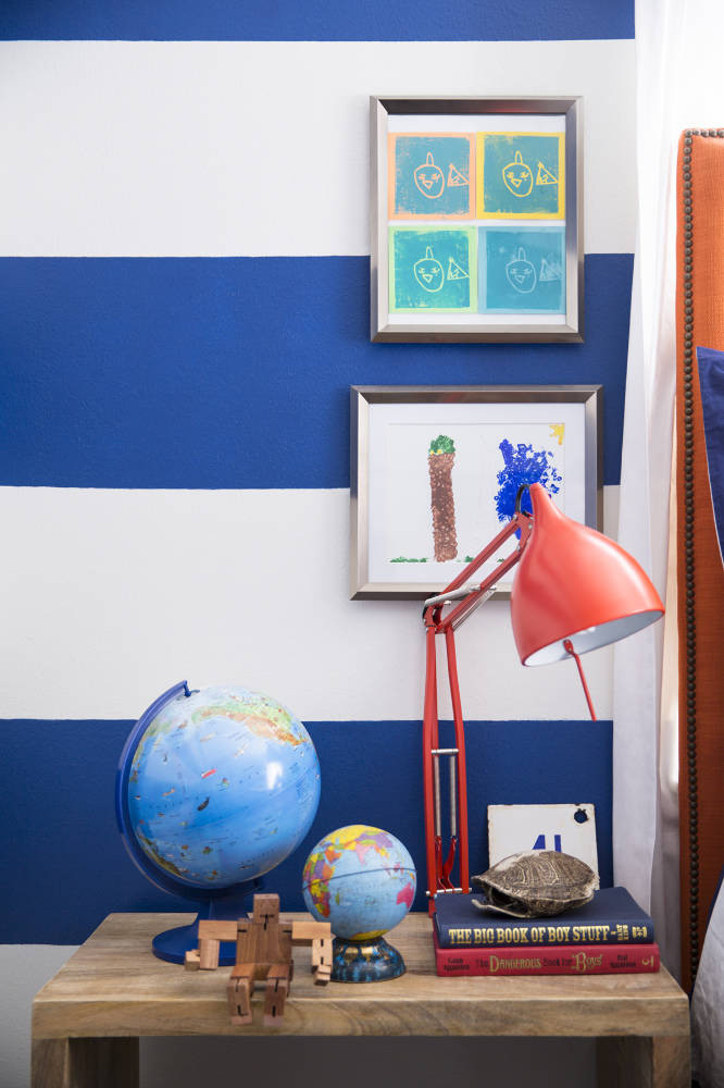 Striped royal-blue walls contribute a playful touch to a young boy’s room.