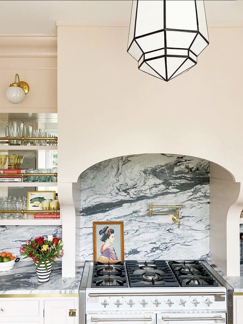 Look past the pool ball–filled bowl and ginormous cutting board on slide three of the expectant mother’s virtual Instagram showcase and you’ll see three open shelves lined with the same stone that makes up the backsplash. The surface’s striking yellow veins suggest it’s likely a slab of Calacatta Gold—a pricey variety of marble that’s fitting for a celebrity’s “passion project.”