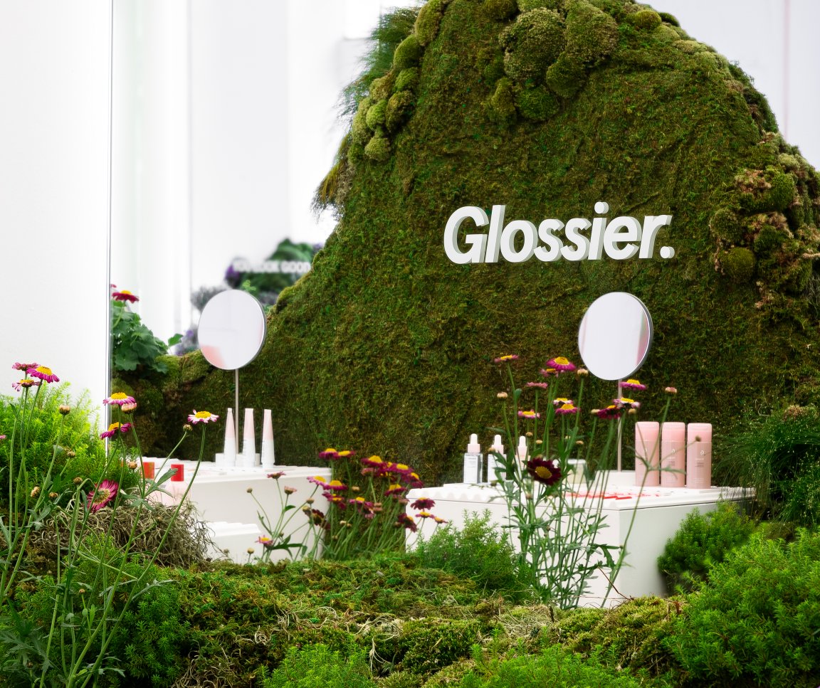 Walking into the new Glossier retail experience in Seattle, you might be confused. Part moss-covered forest, part makeup and skincare boutique, it’s a visual feast. Picture the brand’s beloved pastel-colored tubes and bottles displayed on simple white plinths that emerge from lush foliage dotted with wildflowers.