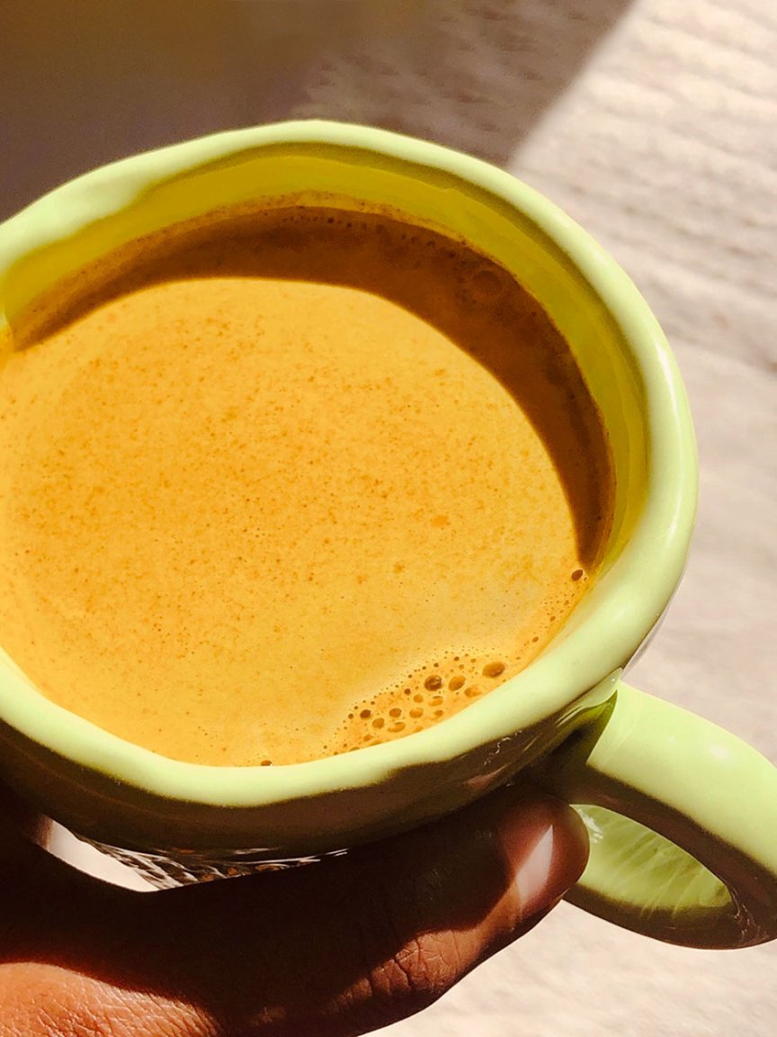 How to make it: Brew a shot of espresso in a Moka pot, pour it over ice, add a spoonful of the turmeric-cacao blend and a little bit of coconut milk, and mix.