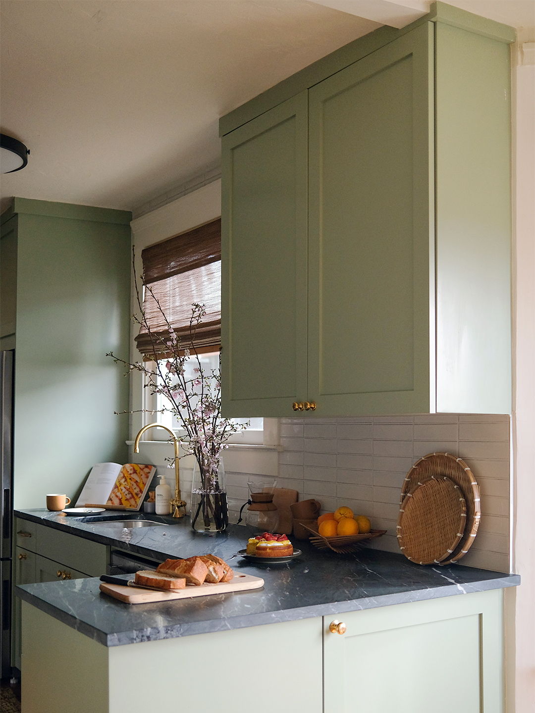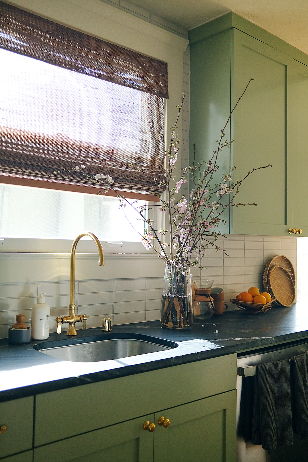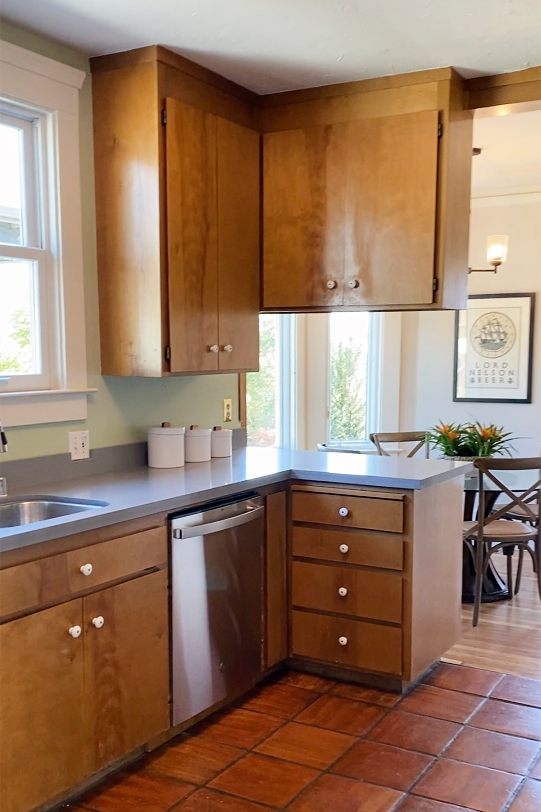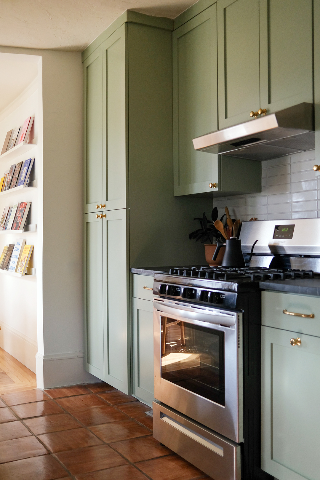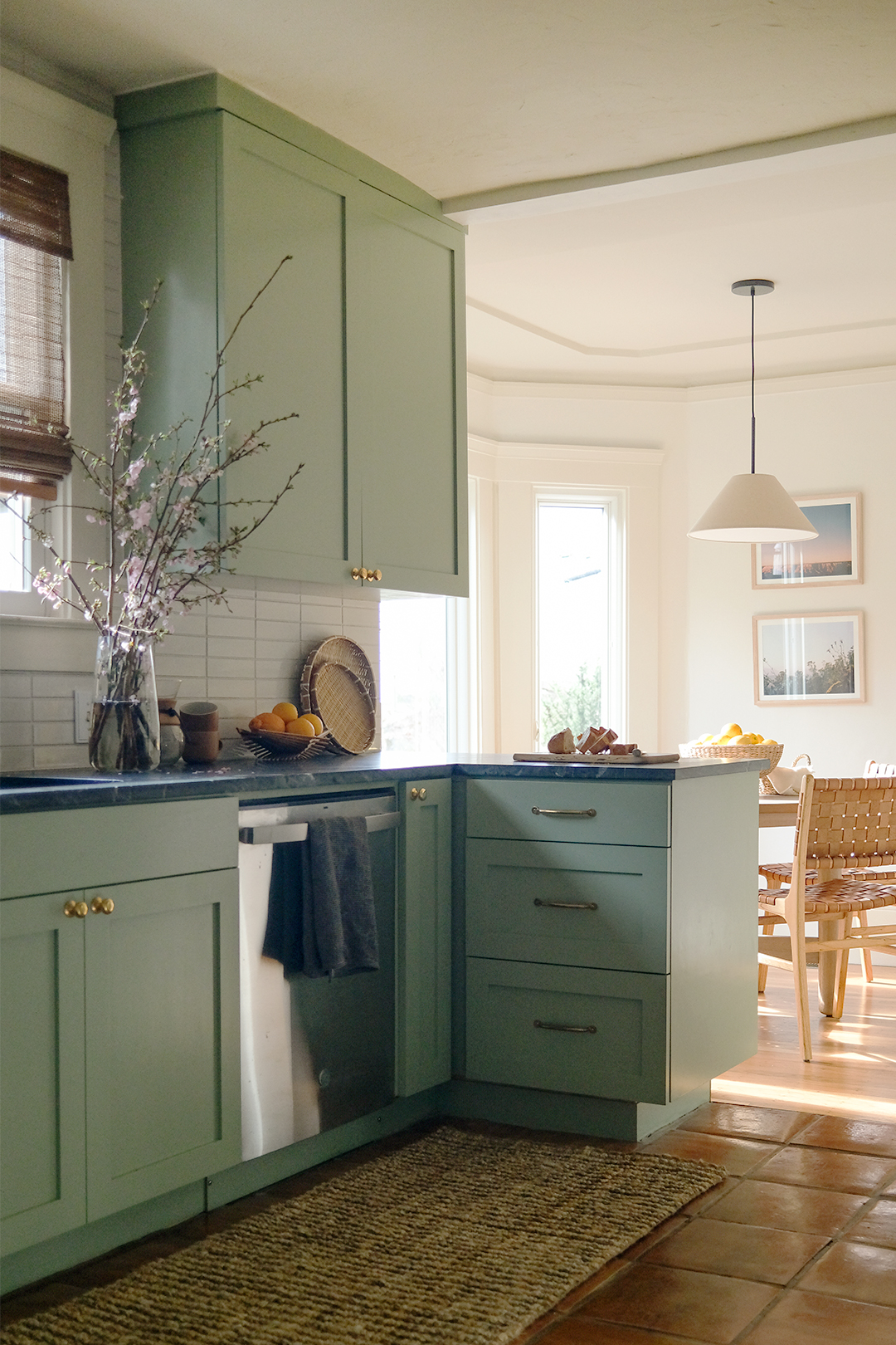 The remaining cabinets also got the boot, replaced with brand-new boxes coated in a pea green color. “I was worried the black and green combo would be too dark,” says Jessica, “but it actually makes it feel cozier.” The terracotta floors, however, are original—and part of the reason the pair fell in love with the Craftsman in the first place.