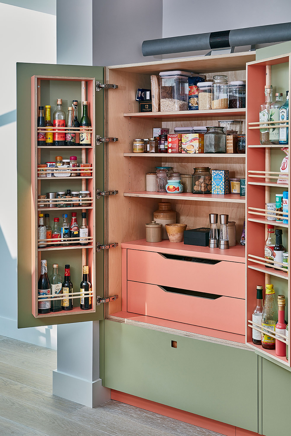 Despite lots of thoughtful extras—ergonomic cutout reset handles that don’t take away from the cabinetry, custom birch plywood cabinet sizes for a perfect fit, contrasting skirting below the green cupboards—“it’s a fresh, clean, and uncomplicated kitchen,” say the homeowners. The standout moment is hidden from view behind what looks like all the other doors: the pantry, a Pluck signature and Glaiser’s “little moment of showing off.” Doweled door racks placed at varying heights easily house tall bottles of vinegar and squat spice jars alike, while a stack of drawers doubles as a shelf for everyday essentials. “There’s huge joy in opening the double doors; it’s this grand gesture,” says Glasier.