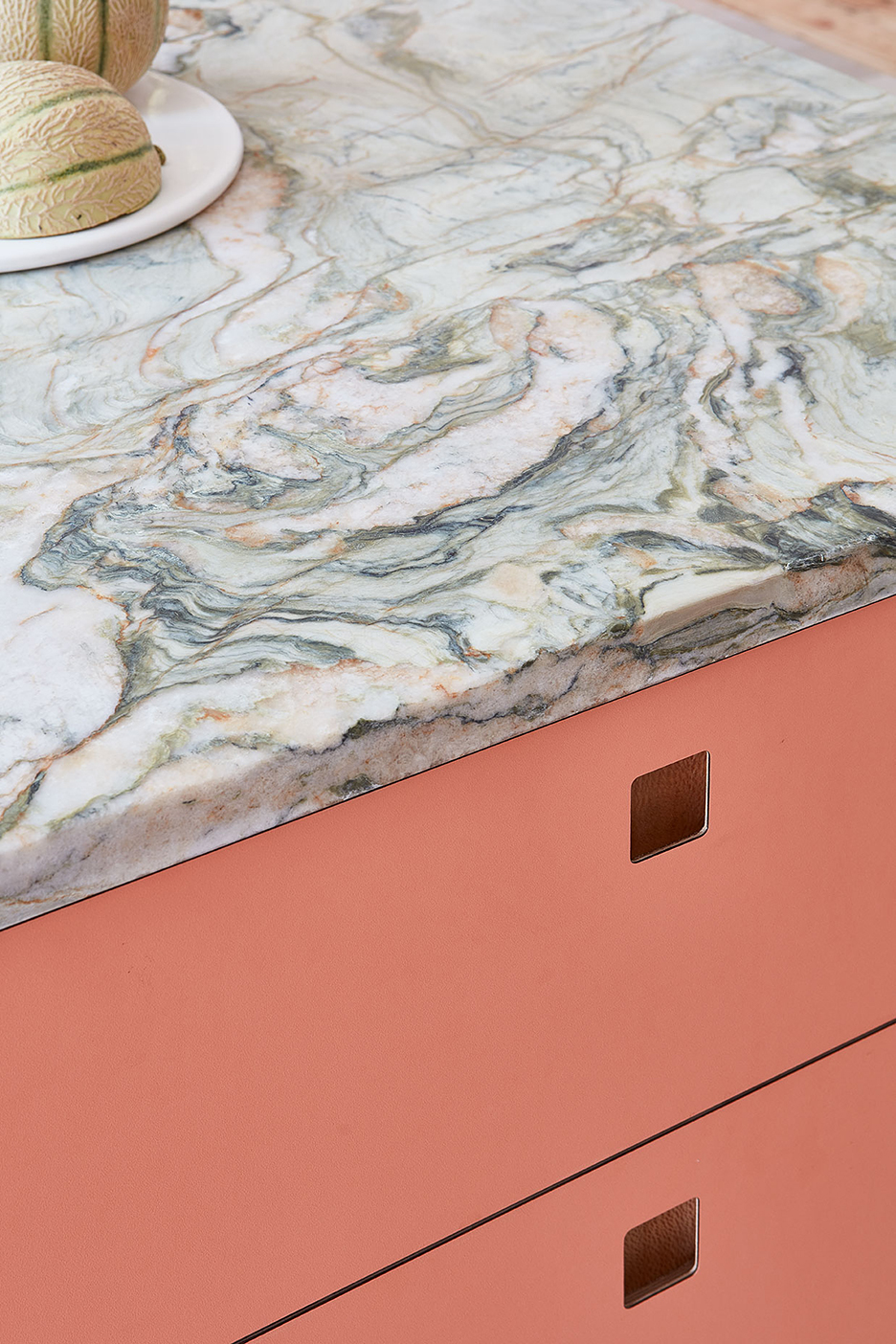 While the couple always knew they wanted to go with green for their kitchen, they were keen to choose a paler, yellower laminate. But Glaiser pushed them toward Pluck’s Brockwell Moss, a shade with gray undertones, and Ritzy, a peachy pink, for a tried-and-true contrast—they sit on opposite ends of the color wheel as close cousins of basic red and green. “While the colors in this kitchen are bold, they also follow the classic rules of color theory,” says Glaiser. “That’s why the combination works.”