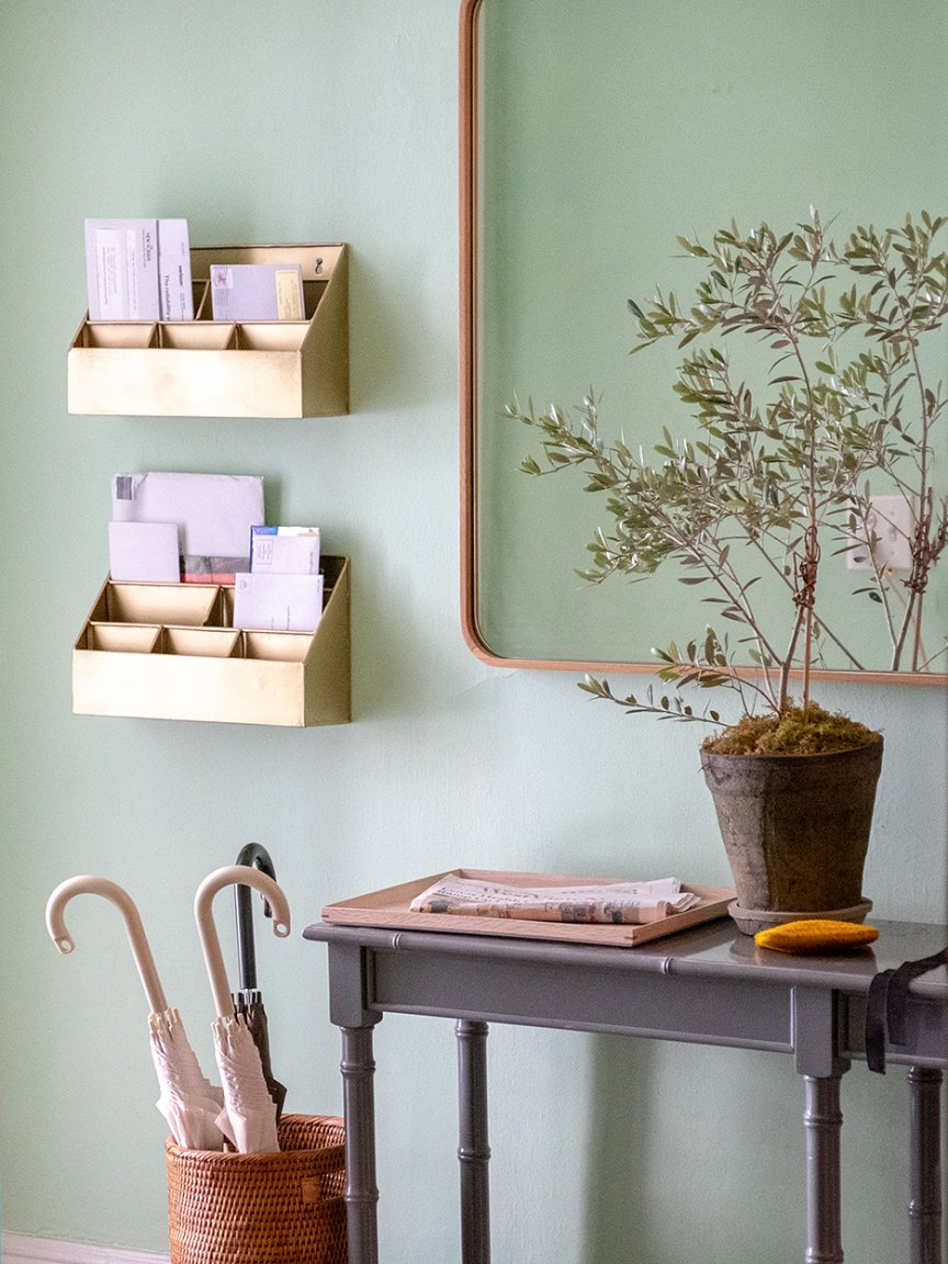 From a practical standpoint, we needed to be able to sort mail, but our previous organizer took up way too much tabletop space. In lieu of a catchall container, I switched things up with two brass holders from Anthropologie that hang on the wall. They take up less room and have multiple compartments that make separating bills from grocery shopping lists a breeze.