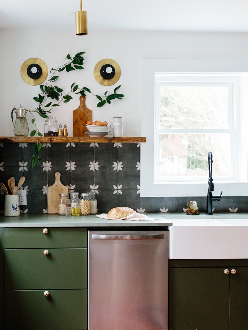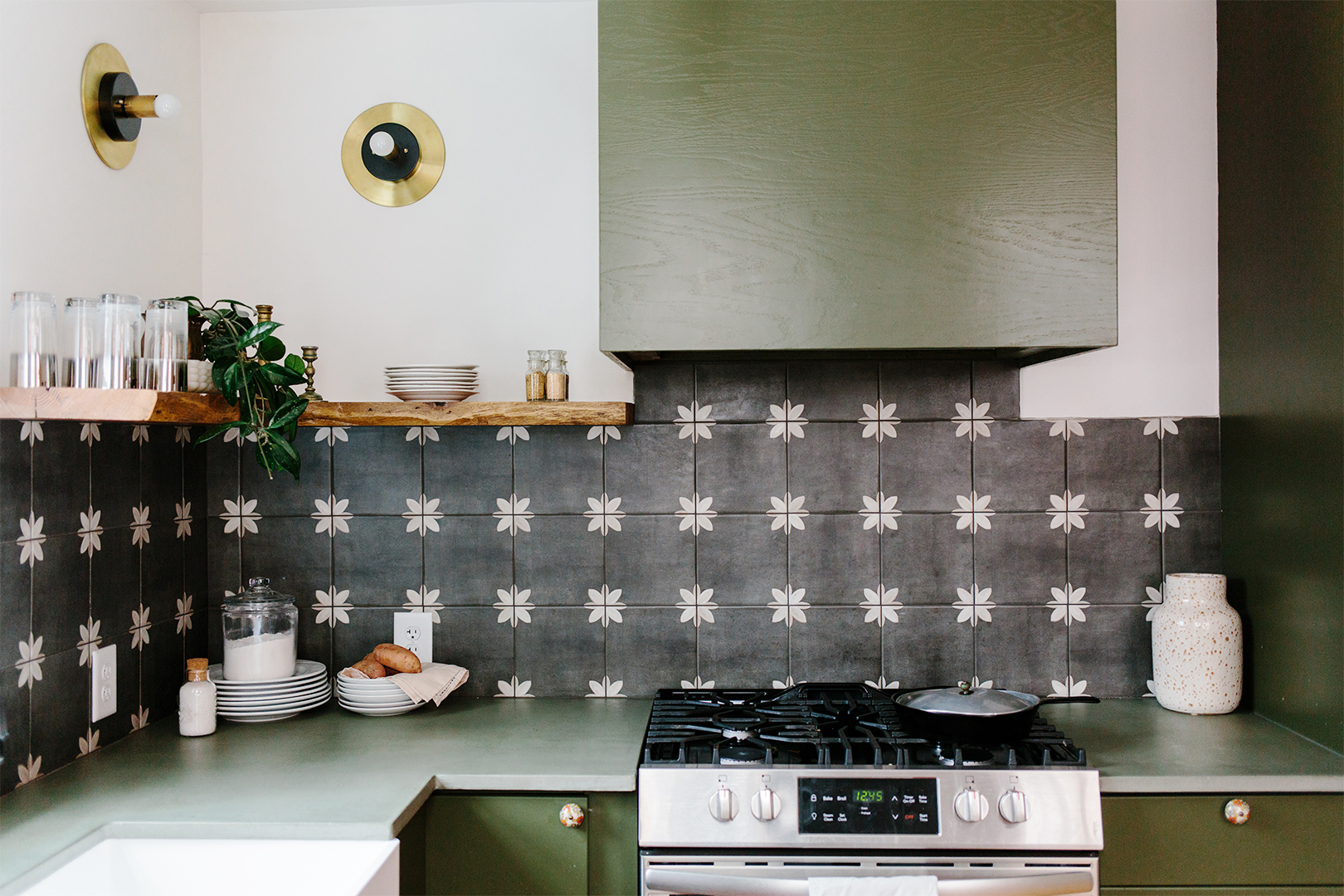 Transforming the kitchen was just one to-do on their punch list—the couple was remodeling the entire Lancaster, Pennsylvania, townhome with the intention to sell—but it took up a good chunk of their budget, totaling $15,000. They turned the small space around with army green concrete counters, a porcelain tile backsplash, and brass ceiling pendants, all without losing its retro roots. “With houses like this, I want to pay homage to the original owners: what their style and taste would have been as they lovingly designed the home,” says Claudia. We went behind the scenes of the storied refresh.