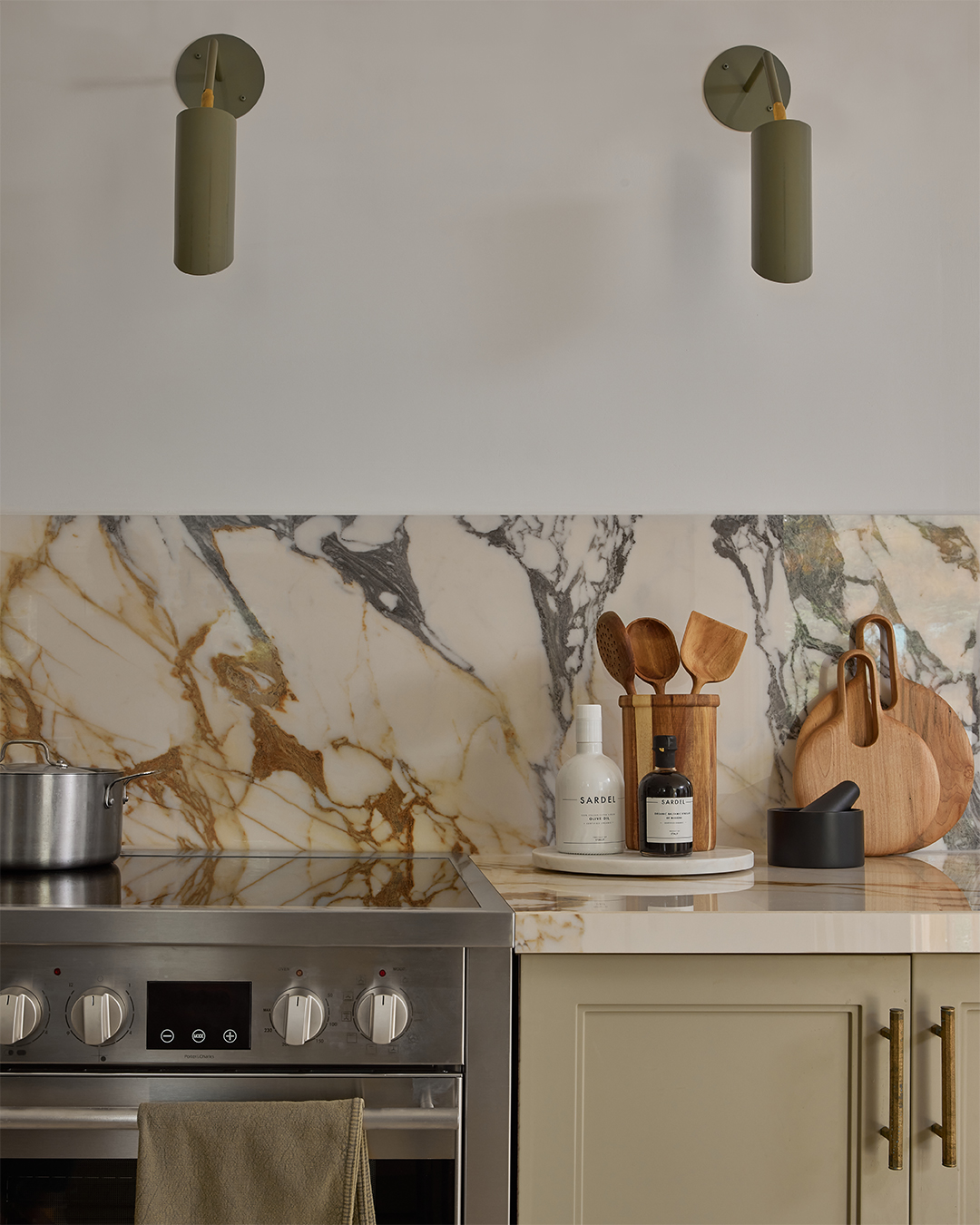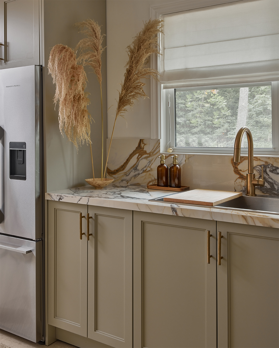 Hachey and Smith worked with Canadian company Allstyle Retrofit to upgrade the kitchen’s existing premium-grade IKEA cabinet frames with modern fronts (a big win for their budget). Inspired by their countertop choice, they swathed the new doors in Benjamin Moore’s Nantucket Gray. But don’t be fooled by its name: The sagey olive green tone is a far cry from the basic neutral.