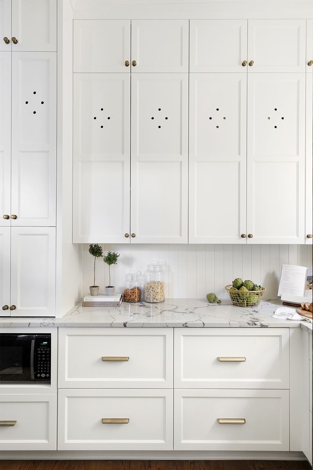 Fredrickson didn’t want the kitchen to feel completely contemporary, but her aesthetic does lean towards more simple, understated styles. And since the room is along the north side of the house, she wanted it to feel “light and airy”—a feat accomplished by classic Carrara marble on both the countertops and the island, as well as a large, white porcelain sink. Plus, decorative drilling in diamond shapes lent a historic feel to simple white shaker cabinets, without feeling fussy or overdone.