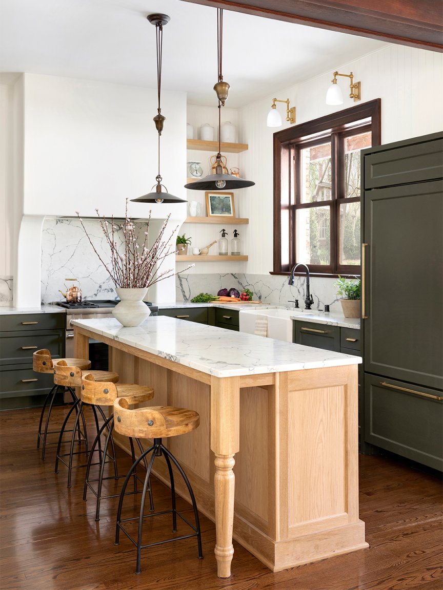 The existing kitchen island also proved to be a challenge—in spite of its large surface area, it was so bulky that the family had a hard time all fitting around it. So, they scrapped it for a more functional, narrower one. “I can’t even tell you how many times we measured the island,” Hammel says. “We worked down to the quarter of the inch to find the perfect size for the space.” It needed to be deep enough to store pots and pans, but slim enough to make family cooking sessions feasible.