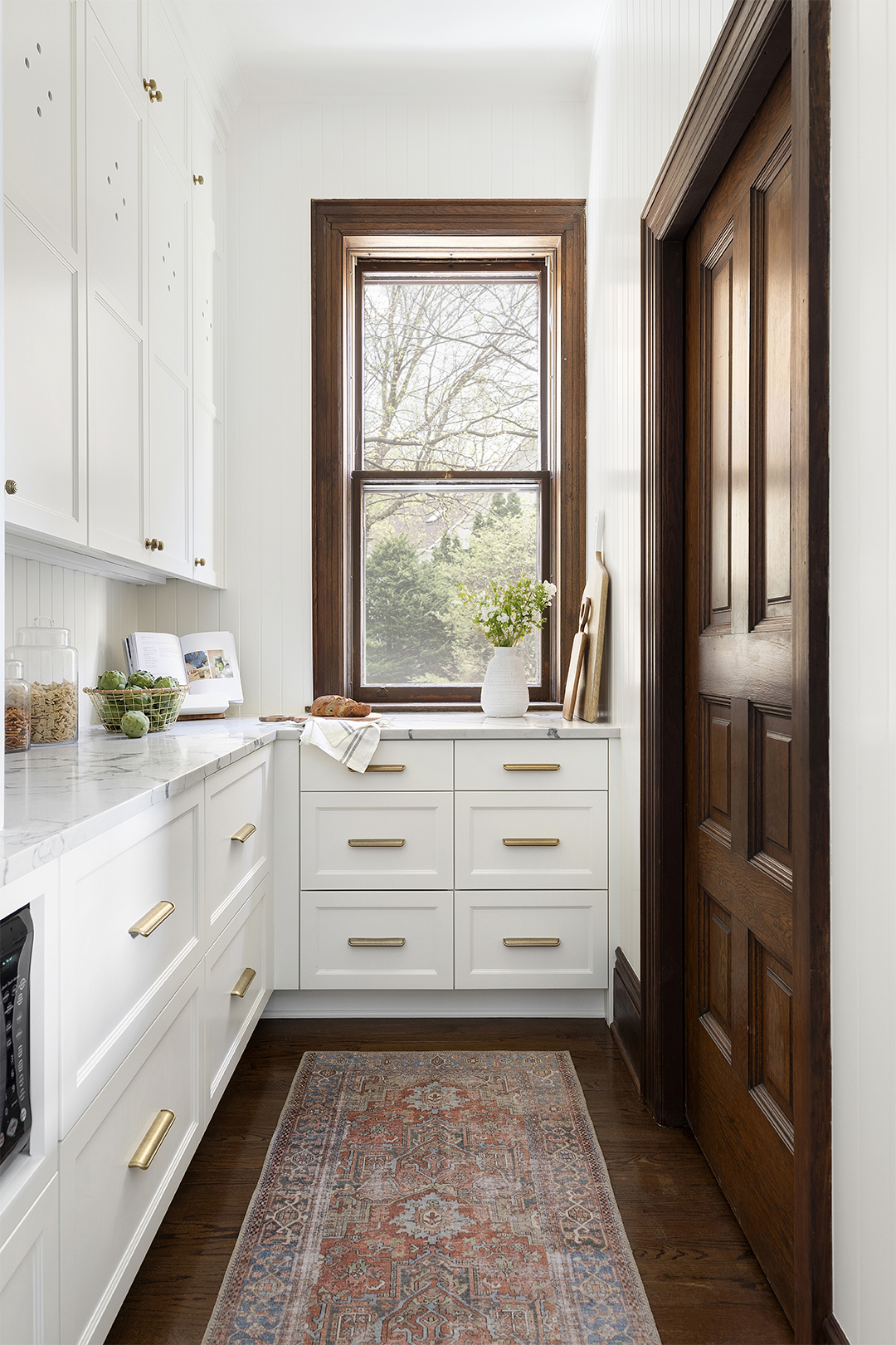 Fredrickson didn’t want the kitchen to feel completely contemporary, but her aesthetic does lean towards more simple, understated styles. And since the room is along the north side of the house, she wanted it to feel “light and airy”—a feat accomplished by classic Carrara marble on both the countertops and the island, as well as a large, white porcelain sink. Plus, decorative drilling in diamond shapes lent a historic feel to simple white shaker cabinets, without feeling fussy or overdone.