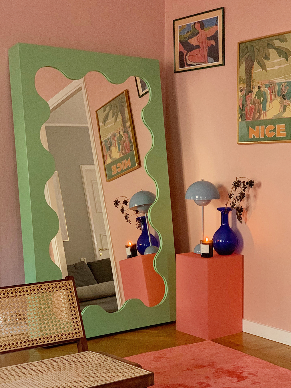 Take, for example, Danish floral designer Cathrine de Lichtenberg’s lavender mirror, which is in good company among other pastels, like the mint green from the walls and the nearby blush pink rug. Stockholm-based creative Linn Eklund went a subtler (okay, slightly subtler) route with her plain white version. It sits in a room that’s largely monochromatic, save for the ultraviolet-hued armchair.