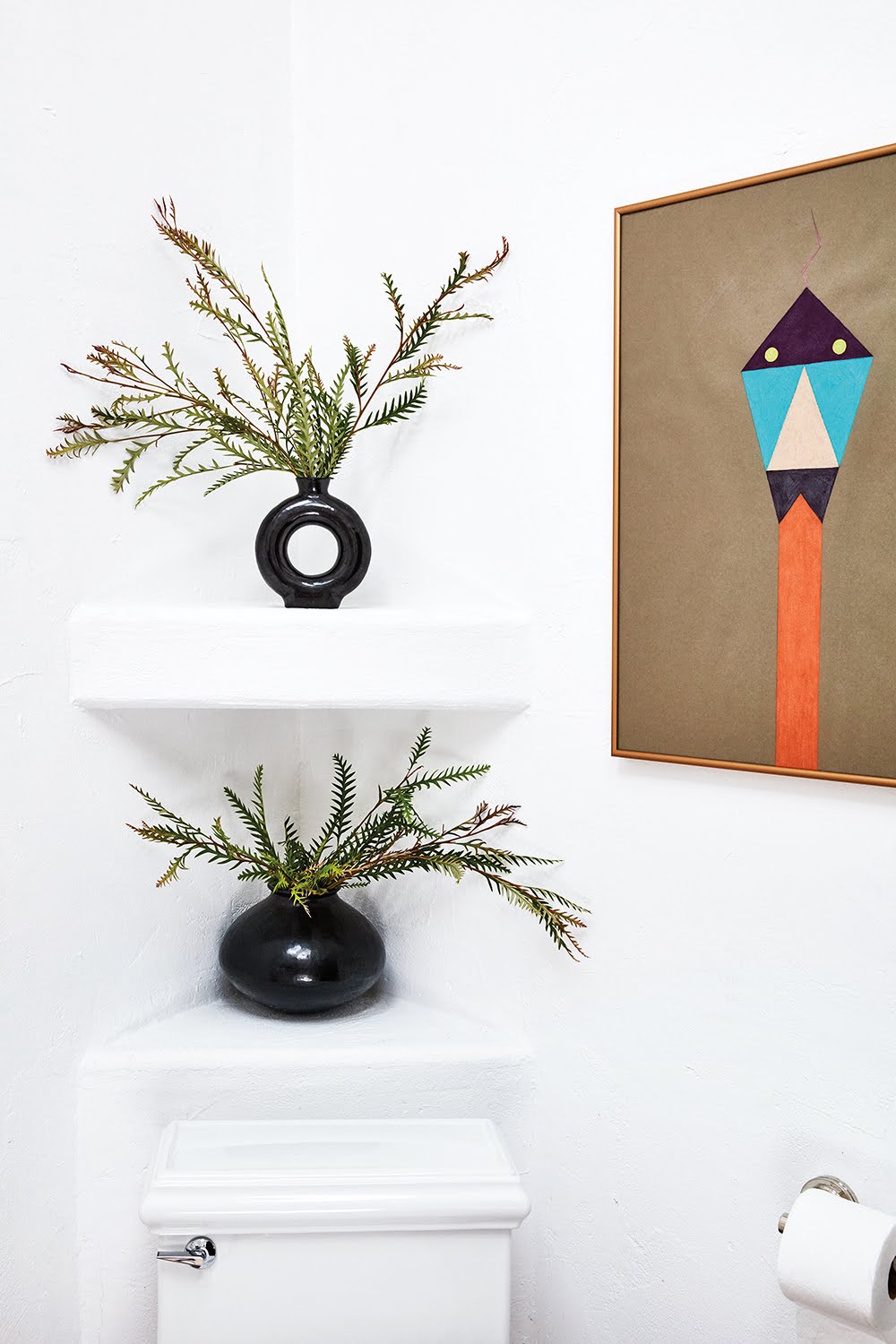 [In this image: Pieces by friends are peppered throughout, including a drawing in the bathroom by Carly Jo Morgan. Vintage Barro Negro Vases from Oaxaca, Mexico; Painting Carly Jo Morgan.]