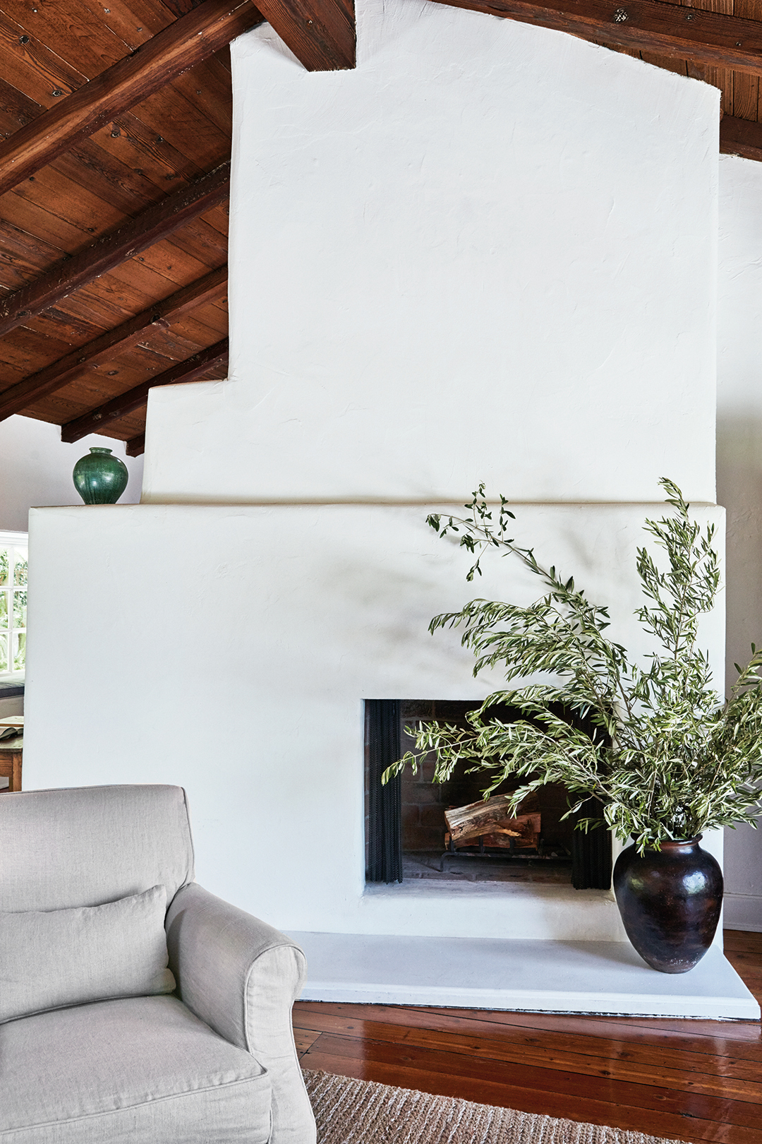 Blending the couple’s two styles took some negotiation. His leans toward mid-century modern, while hers is more earthy and cozy. What they settled on was a refined-meets-rustic look, with exposed wood beams, skylights, textured stucco walls, and a soft neutral color palette. (Axel Vervoordt, Atelier AM, and Rose Uniacke were frequent sources of inspiration.)