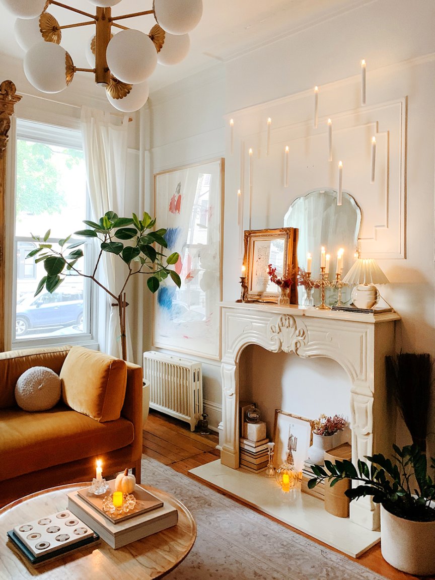 Mallory Fletchall’s Brooklyn apartment is the epitome of bright and airy—and that doesn’t change come October. Instead of adhering fake bats to her gorgeous molding-clad walls or crowding the mantel with gourds, the Reserve Home founder is opting for something a bit more luminous this Halloween: floating candles.