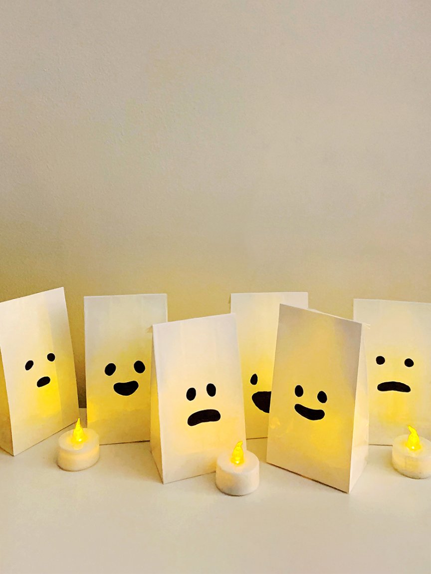 Using white paper treat bags (which she asked her boys to draw on with a Sharpie but kept the end use a surprise), Jang then popped an LED tea light into each, filled them with a few candies and snacks, and scattered the bags around, scavenger hunt–style. “We live in a small city apartment, so we have to get creative about where to hide things—in closets and bathrooms or on bookcases,” she says. If you’re feeling ambitious and have a bigger space to explore, you can write clues to locate each bag.