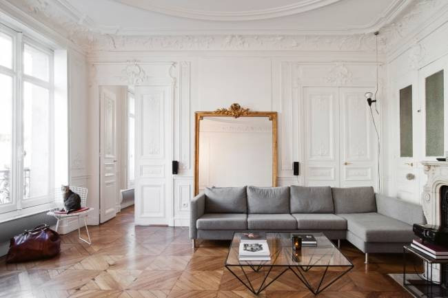 Most people are afraid to add objects to this space that take up space in the actual hallway, like a large leaning mirror. But you shouldn’t be! Look at how simple and elegant this ornate mirror looks in this modern, minimalistic space.