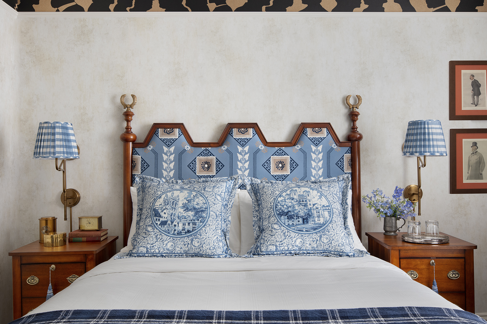 The traditional wood bed frame in this New Haven, Connecticut, guest room breaks away from the typical antique look with its staggered headboard piece—a silhouette that plays nicely with the geometry in the upholstery.