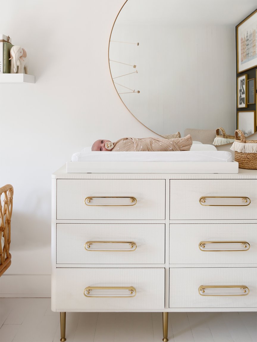 Unless you want to rotate your kids’ furniture every other year, versatility is key. Lee turned a nine-drawer Anthropologie dresser into a bonafide changing station. “I really wanted something Navy James can use when she gets older,” Lee explains. For now, the chest of drawers can be stocked with seasonal clothing and Wet Wipes. When Navy James is beyond the diaper stage, the secured pad on top can be removed and replaced with books and family mementos.