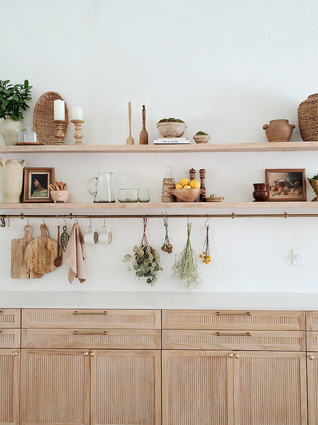 As she is always scouring thrift stores and online marketplaces for vintage finds, Wilcox has amassed quite the vase collection. She needed a place to display her treasures and keep cocktail glasses within easy reach, so she had a pair of 6-foot floating shelves built over the cabinetry. “I needed to use the height and the length of that wall or else the cabinets looked too random,” she explains. Custom shelves were super-expensive, so building allowed Wilcox to both save money and match the exact stain to the cabinet doors. For a cleaner line, she opted out of any sort of brackets underneath, which also allowed for thicker planks and higher weight allowances. (The ledges are supported by anchors drilled into the back of the beams.)