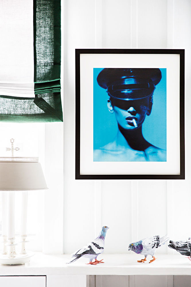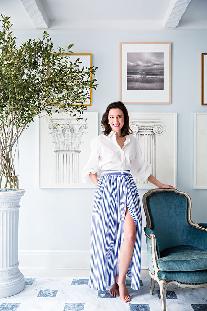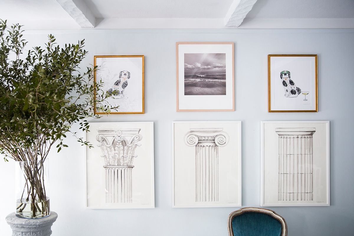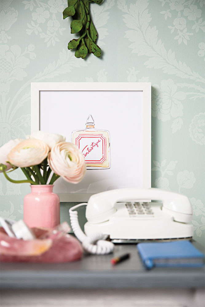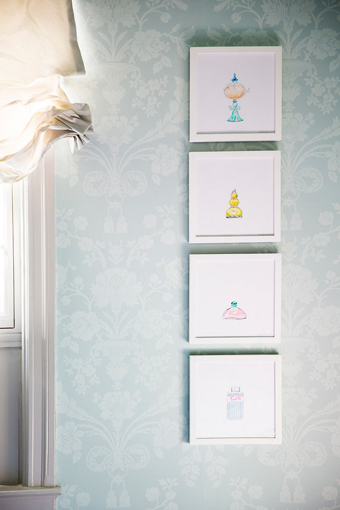 Sarno’s illustrations (available for sale on domino.com) grace the walls of her bedroom.
