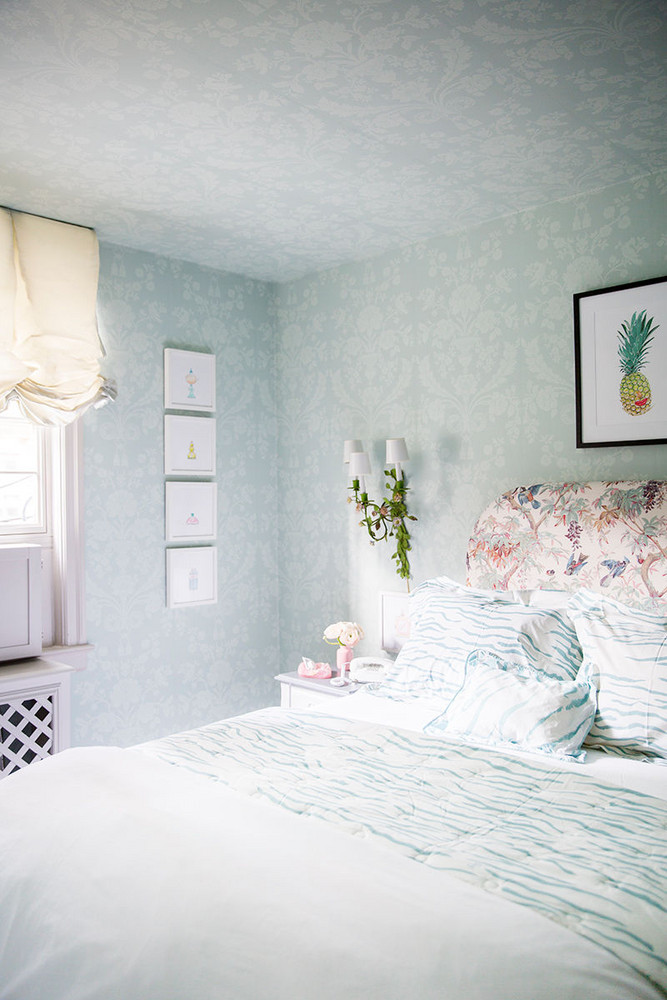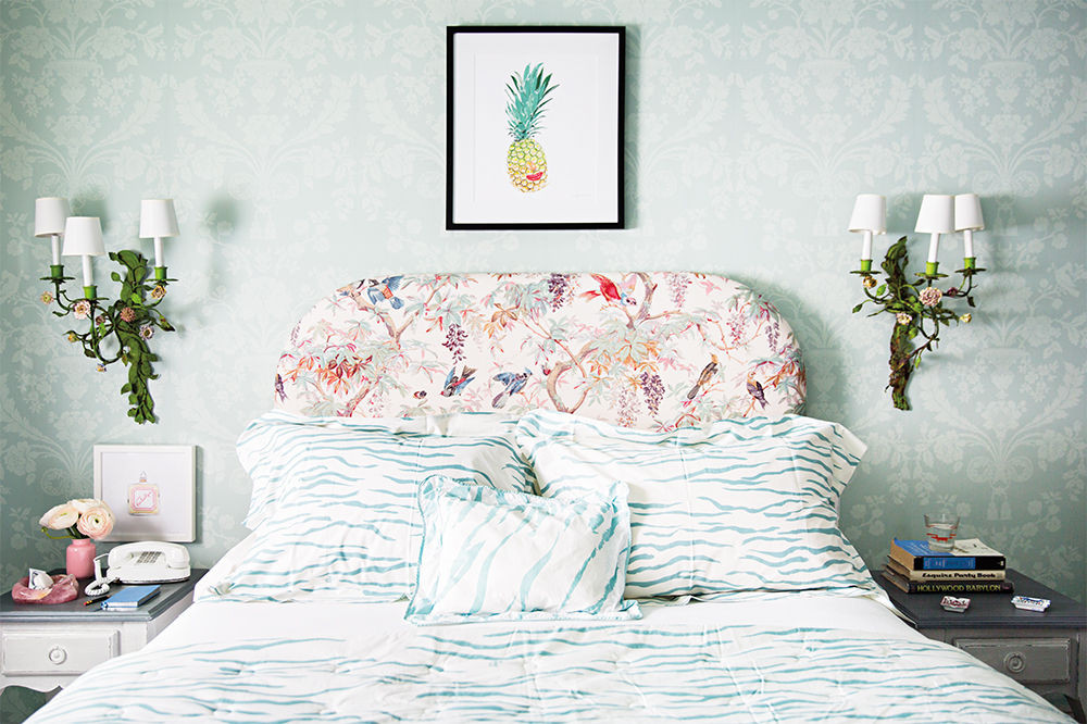 A custom headboard in a Bennison fabric blends seamlessly with tiger-striped Pratesi bedding and pale-green St Antoine wallpaper from Farrow & Ball.
