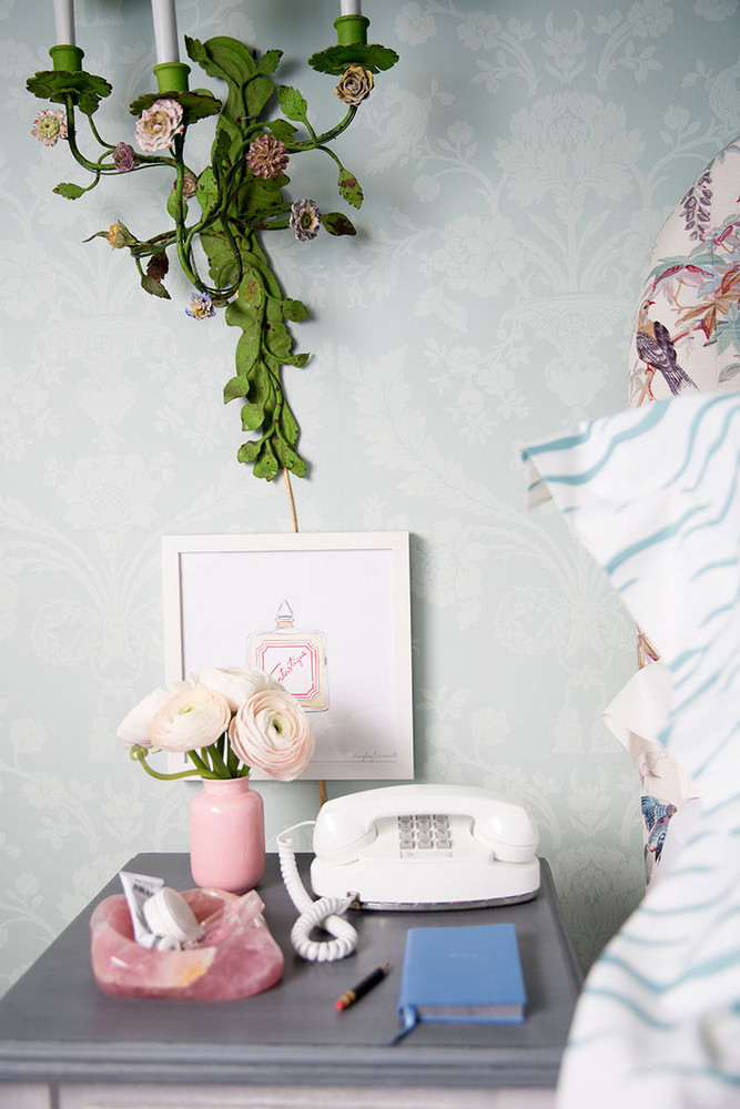 Next, Sarno and Mele scavenged through New York and Connecticut for a selection of furniture that exuded comfort and glamour. In addition to a 19th-century French daybed, they discovered a pair of blue velvet bergères and an ornate vintage mirror. To balance the standout antique silhouettes of these pieces, the duo utilized unexpected art and textiles. Set against silk ruffles, floral upholstery, and animal-print bedding are Sarno’s own stylish creations, including her illustrations of pineapples, parrots, and Staffordshire dogs. There are also works by her mother, the painter Nancy Lee Carter, and uncle, the fashion photographer Tim Carter. “Hayley and I both wanted to infuse elements that we haven’t seen in many of our contemporaries’ homes,” explains Mele. “The apartment’s decor makes a nod toward the best of the past, while still striking a modern chord.”